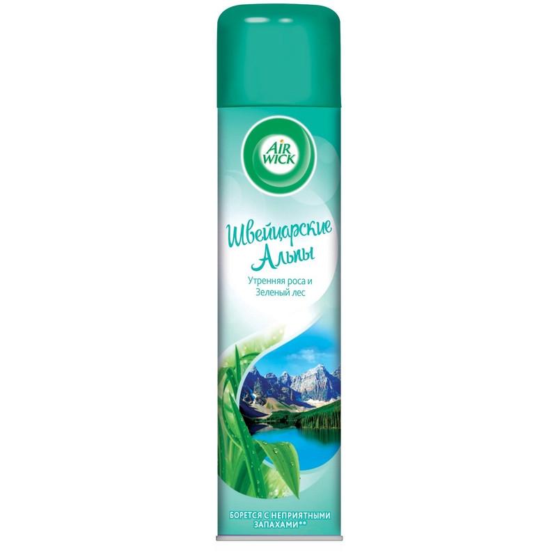 Освежитель воздуха Air Wick Швейцарские Альпы Утренняя роса и Зеленый лес 290 мл<br><br>Назначение/особенности: аэрозоль-освежитель воздуха Air Wick «Швейцарские Альпы» из новой коллекции Ароматы мира эффективно борется с неприятными запахами, оставляя аромат горного воздуха, наполненный свежестью утренней росы и зелёного леса. Изготовлено в соответствии с ГОСТ 32481–2013.<br>Способ применения: хорошо встряхнуть, держа баллон вертикально, нажать на клапан и распылить содержимое баллона от себя к центру помещения.<br>Меры предосторожности: прочитать внимательно этикетку перед использованием. Хранить в недоступном для детей и животных месте. Использовать с осторожностью при повышенной чувствительности к парфюмерным отдушкам (запахам). Освежители воздуха не являются заменой надлежащих мер гигиены. Использовать только в хорошо проветриваемых помещениях. Может вызывать аллергическую реакцию. Меры предосторожности: Баллон находится под давлением. При нагревании возможен разрыв баллона. Предохранять от воздействия прямых солнечных лучей и нагревания выше 50°С. Экстремальные температуры могут возникать в автомобилях, а также вблизи духовок и каминов. Огнеопасно! Не распылять вблизи открытого огня, раскалённых предметов, источников тепла или включённого электрооборудования. Не курить в помещении при использовании аэрозольного баллона. Не прокалывать и не сжигать даже после использования. Не разбирать и не давать детям. При попадании в глаза осторожно промыть водой в течение нескольких минут. При наличии удалить контактные линзы и продолжить промывание. При обращении к врачу иметь при себе упаковку или этикетку. Использовать только по прямому назначению. Не вдыхать аэрозоль. Преднамеренное злоупотребление вдыханием содержимого освежителя воздуха может быть вредным или смертельным. Внимание! Твёрдая поверхность может стать скользкой при попадании на неё освежителя воздуха. Утилизировать вместе с бытовыми отходами. Не содержит озоноразрушающих веществ.<br>Состав: 15% или более, но менее 30% пропеллент (смесь бутана, пропана, изобутана); менее 5% консервант, неионогенные ПАВ, ароматизатор, линалоол.<br>Условия хранения: хранить в недоступном для детей и животных месте.<br>Срок годности: 24 месяца с даты изготовления (дату изготовления см. на упаковке).