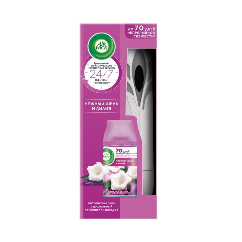 <b>Автоматический освежитель воздуха Air Wick Freshmatic+сменный балон Нежный шелк и лилия 250 мл</b><b>Назначение/особенности: </b> Автоматический освежитель воздуха Air Wick Freshmatic — это небольшое стильное устройство, которое автоматически борется с неприятными запахами день за днем. Аромат «Нежный шелк и лилия» наполнит Ваш дом изысканными нотками цветущей лилии и нежного шелка. Вставьте сменный баллон в элегантное устройство, выберите интенсивность распыления и наслаждайтесь утонченным ароматом Air Wick, разработанным парфюмерными домами Европы. До 70 дней непрерывной свежести. Удобно вешать на стену, размещать на полке или ставить на шкаф. Нормальное функционирование автоматического распылителя гарантировано при использовании сменного баллона Air Wick Freshmatic. Материал корпуса — пластик, цвет — белый. Габаритные размеры — 193×80×80 мм. Состав набора: — Автоматический распылитель воздуха. — Сменный баллон «Нежный шелк и лилия». — 1 батарейка АА. <b>Способ применения: </b> Снимите верхнюю часть изделия, потянув крышку вверх. Переключите контроллер на позицию «Выкл.», как показано на рисунке. Откройте верхнюю часть изделия. Вставьте сменный аэрозольный баллон в нижнюю часть изделия. Закройте изделие, соединив верхнюю и нижнюю части и повернув верхнюю часть по часовой стрелке. Вставьте 1 аккумуляторную батарею АА согласно символам (+) и (—). Установите уровень интенсивности распыления ароматизирующего вещества на контроллере. Не направляйте изделие в лицо. Распыление начнется автоматически через 15 секунд. Максимальная площадь ароматизируемого помещения — 10 м²<b>Меры предосторожности: </b> Беречь от солнечных лучей, избегать нагревания выше 50°С. Беречь от источников воспламенения/нагревания/искр/открытого огня. Не курить. Не распылять вблизи открытого огня или других источников воспламенения. Не нарушать целостности упаковки и не сжигать, даже после использования. Не разбирать и не давать детям. При попадании в глаза: Осторожно промыть глаза водой в течение нескольких минут. Снять контактные линзы, если Вы ими пользуетесь и, если эт легко сделать. Продолжить промывание глаз. При необходимости обратиться за медицинской помощью, по возможности показать упаковку/маркировку продукта. Использовать только по прямому назначению. Не вдыхать аэрозоль. Использовать с осторожностью при повышенной чувствительности к парфюмерным отдушкам. Освежители воздуха не являются заменой надлежащих мер гигиены. Использовать только в хорошо проветриваемых помещениях. Более полная информация по безопасному обращению химической продукции находится в паспорте безопасности. <b>Состав баллона: </b> 30% и более: пропеллент (смесь: Пропан, Бутан), этиловый денатурированный спирт; менее 5%: ароматизирующие добавки, в том числе бензилсалицилат, цитраль, гексилциннамаль, лимонен, линалоол. <b>Условия хранения:</b> Хранить в недоступном для детей и животных месте. <b>Срок годности: </b> 24 месяца.
