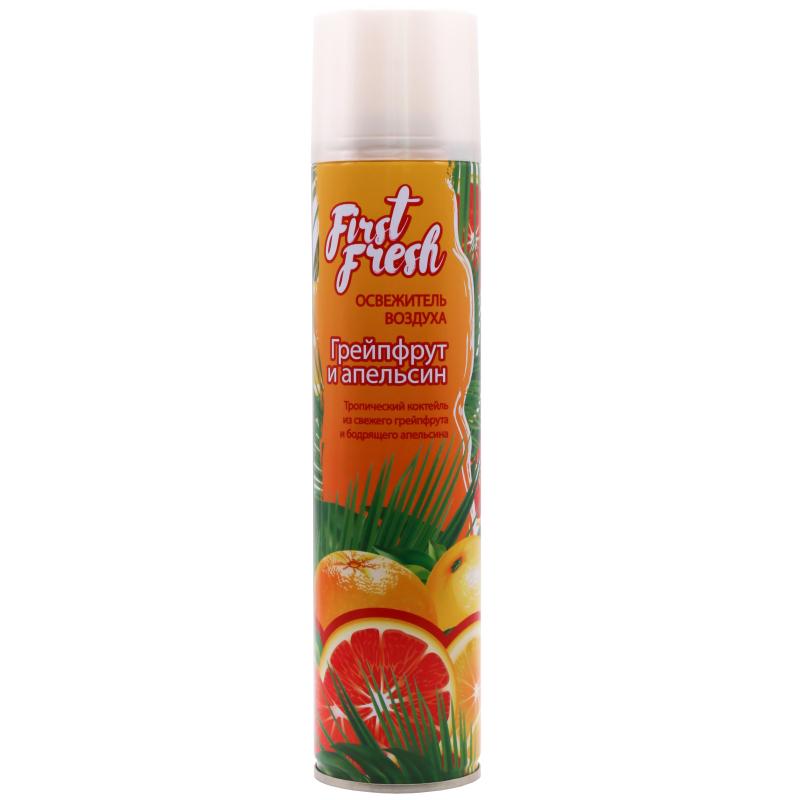 Освежитель воздуха First Fresh Грейпфрут и апельсин 300 мл<br><br>Назначение/особенности: предназначен для устранения неприятных запахов в различных помещениях. ТУ 2389-001-87957643-2009 или ГОСТ 32481–2013.<br>Способ применения: баллон встряхнуть в течение 3-5 секунд. Держа баллон вертикально распылить вверх ближе к центру помещения в течение 2-3 секунд. При необходимости более длительного распыления баллон периодически встряхивать.<br>Меры предосторожности: осторожно! Воспламеняющийся аэрозоль! Содержимое баллона находится под давлением. При нагревании возможен взрыв. Предохранять от действия прямых солнечных лучей и нагревания выше 40°С. Не вскрывать и не сжигать даже после использования! Не распылять вблизи открытого огня, источников тепла и раскалённых предметов! Не курить! Избегать попадания в глаза. Не разбирать и не давать детям.<br>Состав: деионизированная вода (30% и более), пропан/бутан/изобутан (30% и более), парфюмерная композиция (5% и менее), сорбитана монолаурат (5% и менее), натрия нитрит (5% и менее), бензоат натрия (5% и менее).<br>Условия хранения: хранить при температуре от 5°С до 40°С. Использованные баллоны и баллоны с истёкшим сроком годности утилизировать как бытовые отходы. Не содержит озоноразрушающих веществ.<br>Срок годности: 24 месяца с даты изготовления (дату изготовления см.nbsp;на упаковке).