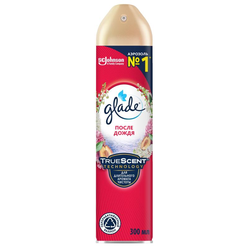Освежитель воздуха Glade После дождя 300 мл<br><br>Назначение/особенности почувствуйте прохладную свежесть цветов, капель дождя и зелёной листвы на фоне умиротворённой природы, омытой росой. True Scent (ТМ) Technology гарантирует безопасность и экспертную формулу своих аэрозолей для создания ощущения чистоты. Парфюмерные композиции с эфирными маслами. Борется с неприятными запахами. Действует мгновенно. Ароматы высокого качества, разработанные лучшими парфюмерными домами мира. Перерабатываемая упаковка. <br>Способ применения: хорошо встряхнуть перед использованием. Направить колпачок к центру комнаты и распылить. <br>Осторожно! Воспламеняющийся аэрозоль. Баллон под давлением. При нагревании возможен взрыв. <br>Меры предосторожности: использовать только по назначению согласно инструкции. Не разбирать и не давать детям! Беречь от источников воспламенения, нагревания, источника искр, открытого огня. Не курить. Не распылять вблизи открытого огня или других источников воспламенения. Не нарушать целостности упаковки и не сжигать, даже после использования. Использовать только в хорошо проветриваемых помещениях. Не допускать попадания в глаза. Лицам с повышенной чувствительностью к ароматам применять средство с осторожностью. Использование освежителя воздуха не заменяет надлежащую гигиену. При попадании в глаза осторожно промыть под водой в течение нескольких минут. Снять контактные линзы, если вы ими пользуетесь и, если это легко сделать. Продолжить промывание глаз. Если раздражение глаз не проходит, обратиться за медицинской помощью. <br>Состав: : вода; больше или равно 15%, но не менее 30% пропеллент (бутан, пропан, изобутан); менее 5% н-ПАВ, фосфаты, отдушка (гексилциннамаль), пропиленгликоль, гидроксид аммония, алкил (С12-16) диметилбензиламмоний хлорид. Потенциальные аллергены. Не содержит озоноразрушающих хладонов. <br>Условия хранения: хранить в сухом, недоступном для детей и домашних животных месте при температуре от −5°C до +35°C, отдельно от пищевых продуктов. Беречь от солнечных лучей, избегать нагревания выше 50°C. <br>Срок годности 36 месяцев с даты изготовления (дату изготовления см. на упаковке). После использования или по окончании срока годности упаковку/содержимое утилизировать как бытовые отходы.