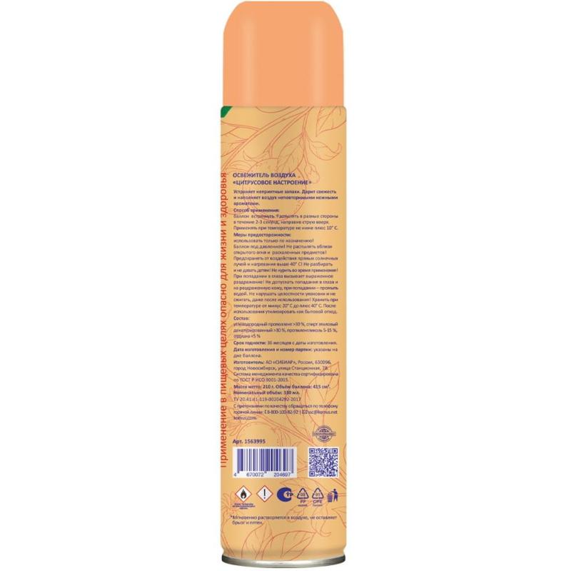 Освежитель воздуха Luscan Цитрусовое настроение 330 мл сухое распыление<br><br>Назначение/особенности: освежитель для воздуха Luscan нейтрализует запахи и дарит нежный цитрусовый аромат. Подходит для дома и любых общественных мест. Формула сухого распыления экономична в использовании и не оставляет следов на поверхности.<br>Способ применения: баллон встряхнуть. Распылять в разные стороны в течение 2-3 секунд, направив струю вверх. Применять при температуре не ниже плюс 10°C.<br>Меры предосторожности: использовать только по назначению! Баллон под давлением! Не распылять вблизи открытого огня и раскалённых предметов! Предохранять от воздействия прямых солнечных лучей и нагревания выше 40°C! Не разбирать и не давать детям! Не курить во время применения! При попадании в глаза вызывает выраженное раздражение! Не допускать попадания в глаза и на раздражённую кожу, при попадании — промыть водой. Не нарушать целостности упаковки и не сжигать, даже после использования!<br>Состав: углеводородный пропеллент >30%, спирт этиловый денатурированный >30%, пропиленгликоль 5–15%, отдушка <5%.<br>Условия хранения: хранить при температуре от минус 20°С до плюс 40°С. После использования утилизировать как бытовой отход.<br>Срок годности: 36 месяцев с даты изготовления (дату изготовления см. на упаковке).