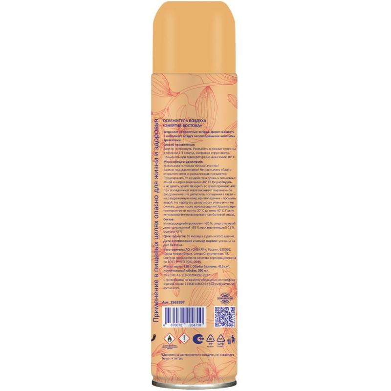 Освежитель воздуха Luscan Энергия востока 330 мл сухое распыление<br><br>Назначение/особенности: освежитель для воздуха Luscan нейтрализует запахи и дарит нежный свежий аромат. Подходит для дома и любых общественных мест. Формула сухого распыления экономична в использовании и не оставляет следов на поверхности.<br>Способ применения: баллон встряхнуть. Распылять в разные стороны в течение 2-3 секунд, направив струю вверх. Применять при температуре не ниже плюс 10°C.<br>Меры предосторожности: использовать только по назначению! Баллон под давлением! Не распылять вблизи открытого огня и раскалённых предметов! Предохранять от воздействия прямых солнечных лучей и нагревания выше 40°C! Не разбирать и не давать детям! Не курить во время применения! При попадании в глаза вызывает выраженное раздражение! Не допускать попадания в глаза и на раздражённую кожу, при попадании — промыть водой. Не нарушать целостности упаковки и не сжигать, даже после использования!<br>Состав: углеводородный пропеллент >30%, спирт этиловый денатурированный >30%, пропиленгликоль 5–15%, отдушка <5%.<br>Условия хранения: хранить при температуре от минус 20°С до плюс 40°С. После использования утилизировать как бытовой отход.<br>Срок годности: 36 месяцев с даты изготовления (дату изготовления см. на упаковке).