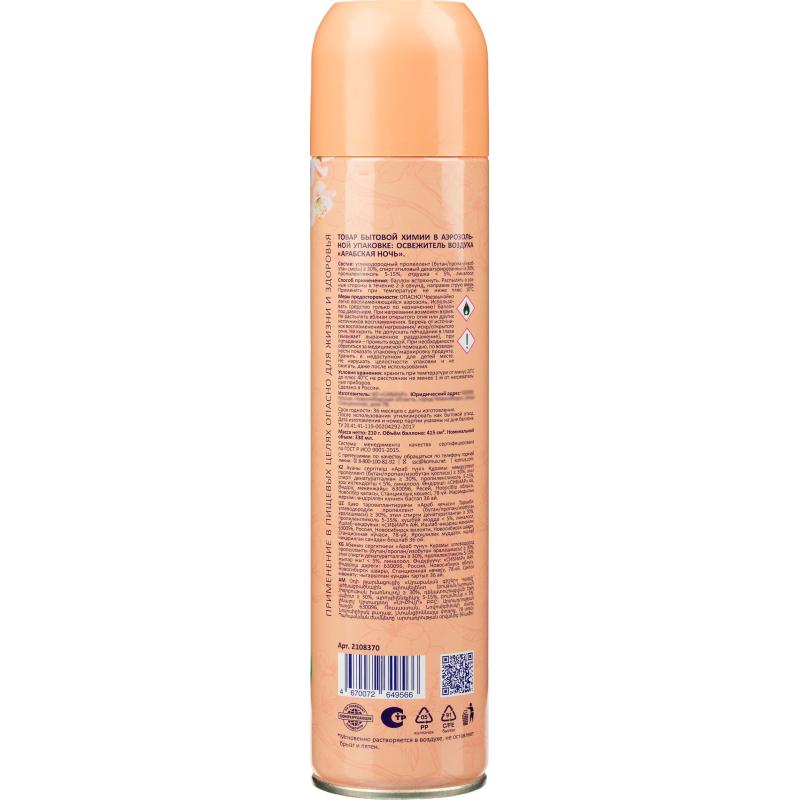 Освежитель воздуха Luscan Арабская ночь 330 мл сухое распыление<br><br>Назначение/особенности: освежитель для воздуха Luscan нейтрализует запахи и дарит нежный свежий аромат. Подходит для дома и любых общественных мест. Формула сухого распыления экономична в использовании и не оставляет следов на поверхности.<br>Способ применения: баллон встряхнуть. Распылять в разные стороны в течение 2–3 секунд, направив струю вверх. Применять при температуре не ниже плюс 10 °C.<br>Меры предосторожности: использовать только по назначению! Баллон под давлением! Не распылять вблизи открытого огня и раскалённых предметов! Предохранять от воздействия прямых солнечных лучей и нагревания выше 40 °C! Не разбирать и не давать детям! Не курить во время применения! При попадании в глаза вызывает выраженное раздражение! Не допускать попадания в глаза и на раздражённую кожу, при попадании — промыть водой. Не нарушать целостности упаковки и не сжигать, даже после использования!<br>Состав: углеводородный пропеллент >30%, спирт этиловый денатурированный >30%, пропиленгликоль 5–15%, отдушка <5%.<br>Условия хранения: хранить при температуре от минус 20 °С до плюс 40 °С. После использования утилизировать как бытовой отход.<br>Срок годности: 36 месяцев с даты изготовления (дату изготовления см. на упаковке).