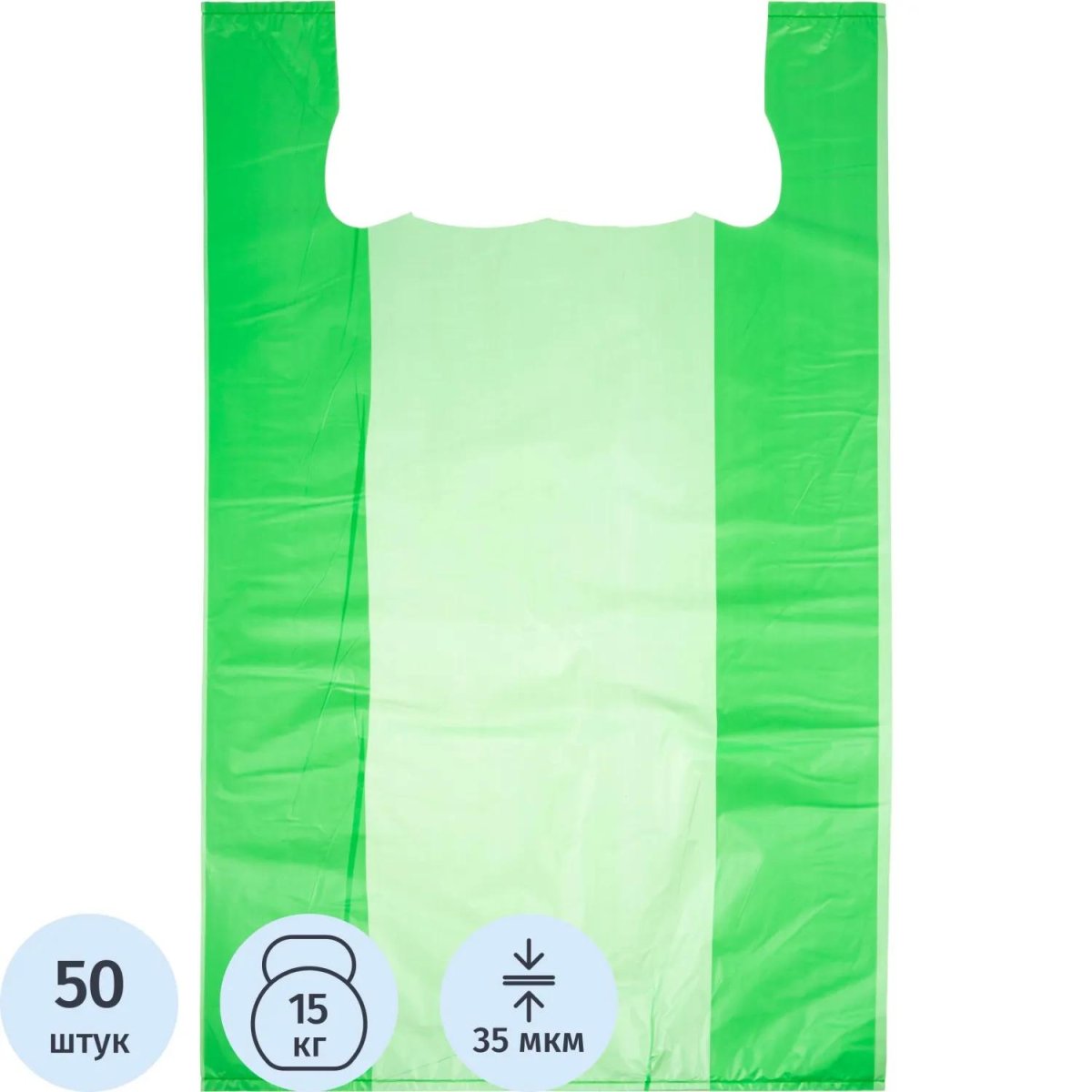 Пакет-майка 42+18×68 см не содержит токсических веществ. Длина каждого пакета с ручками — 68 см, ширина — 42 см, ширина бокового фальца — 18 см. В упаковке — 50 пакетов зелёного цвета. Сфера применения: для упаковки, хранения и транспортировки вещей, предметов, продуктов питания; для совершения покупок с супермаркетах, магазинах, у частных продавцов.