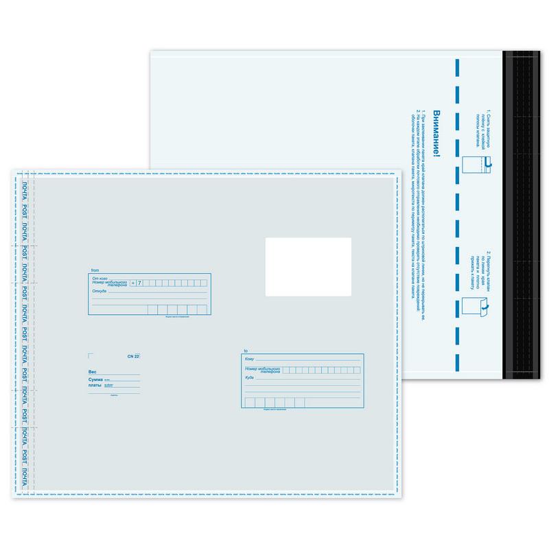 Пакет E4 (320×355 мм) из полиэтилена 70 мкм стрип (400 штук в упаковке). Оснащен почтовым подсказом ’Куда-Кому’ и отрывной клейкой лентой. Благодаря специальному прочному шву с микротекстом и специальным линиям просечек с защитным текстом на клапане предотвращает несанкционированное вскрытие. Имеет зону для нанесения шариковой ручкой надписей, оттисков штемпелей и не допускают их истирания при обработке и транспортировке. Многослойный полиэтилен защищает вложение от влаги и механических повреждений, непрозрачность исключает возможность определить содержимое. Предназначен для пересылки всех видов почтовых отправлений — писем, бандеролей и других видов отправлений.