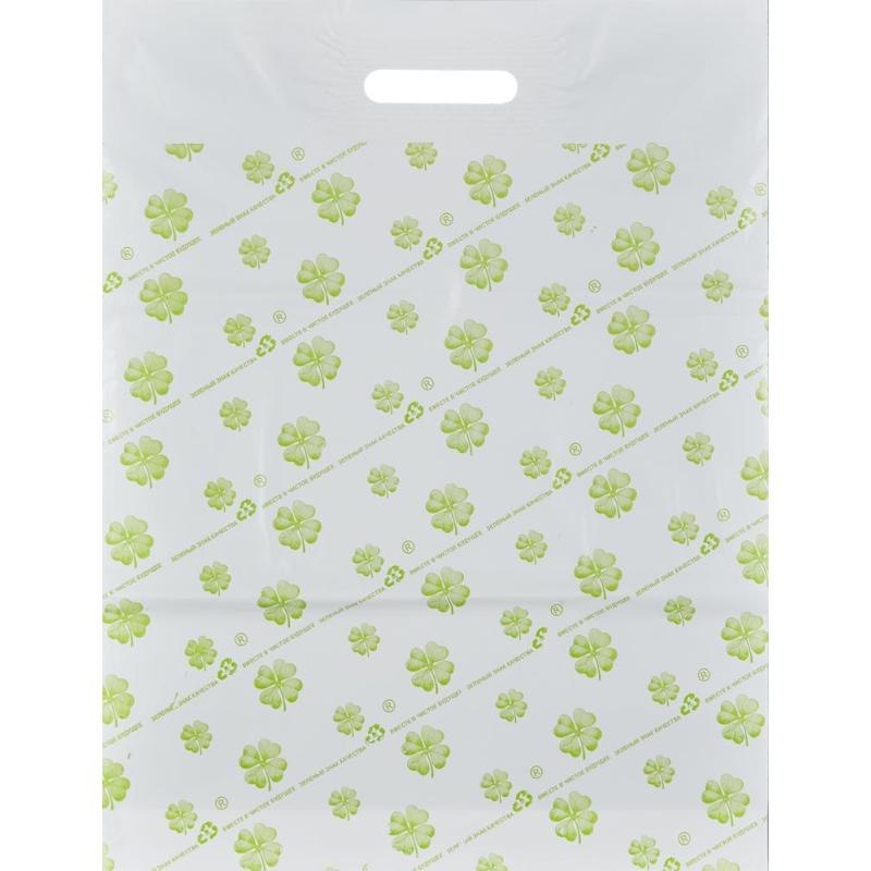 Пакет полиэтиленовый Знак Качества белый 38×54 см с вырубной ручкой (50 штук в упаковке)<br>Пакеты ПВД прочны при растяжении и сжатии, стойки к удару и разрыву, устойчивы к проколам и поперечным разрывам. При больших нагрузках могут немного растягиваться или трескаться, но не рваться. Водо- и паронепроницаемы. Пакеты не шуршат и имеют глянцевую поверхность. Уязвимы для воздействия газов, легко окисляются. Выдерживают нагрузку до 10 кг. Надпись на пакете: 'Зеленый знак качества'.