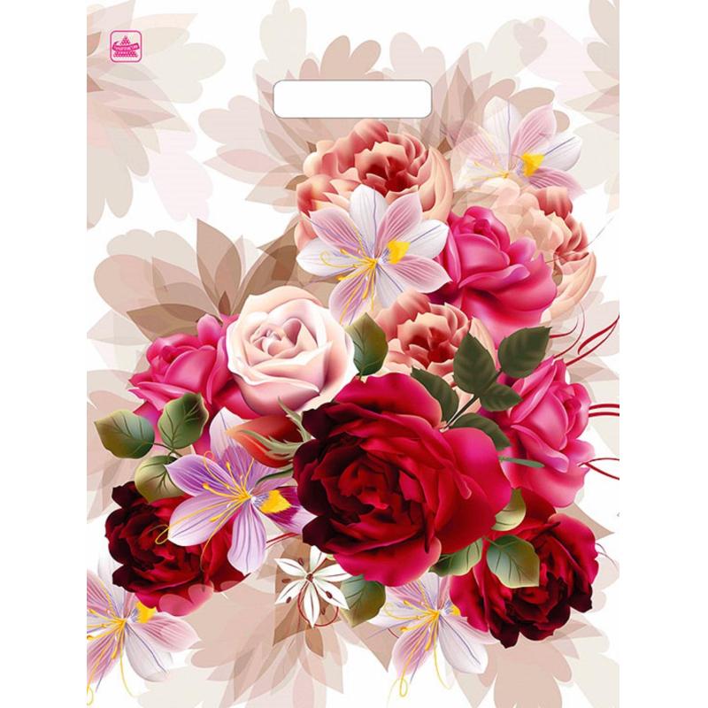 Пакет полиэтиленовый бежевый 31×40 см с вырубной ручкой (50 штук в упаковке). Этот великолепный аксессуар станет не только практичным решением для упаковки, но и стильным дополнением к любому подарку или покупке.<br>Преимущества:<br>— яркий и привлекательный дизайн (пакет украшен живописным букетом цветов из пионов и роз, выполненным в теплых телесных, нежных розовых и насыщенных бордовых оттенках, такой дизайн добавит ярких красок в повседневную жизнь ваших клиентов);<br>— укрепленные вырубные ручки (прочные и удобные ручки обеспечивают надежный захват и комфорт при переноске, что делает пакет идеальным выбором для покупок, подарков или сувениров);<br>— средний размер (с размерами 400 на 310 мм этот пакет предлагает достаточно пространства для упаковки разнообразных товаров, от одежды до подарков).<br>Это стильный аксессуар, который подчеркивает вкус и изящество. Он станет отличным выбором для магазинов, цветочных лавок, подарочных магазинов и свадебных мероприятий.