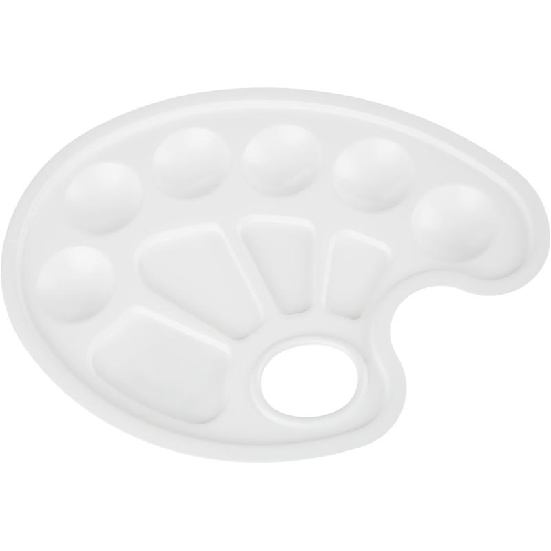 Палитра из пластмассы овальной формы с отверстием для удобства держания в руке, для смешивания красок. Легкая и практичная с отверстием для руки удобна в использовании и является незаменимой и для начинающих<br /> художников и для профессиональных творцов.<br /> Цвет: белый.