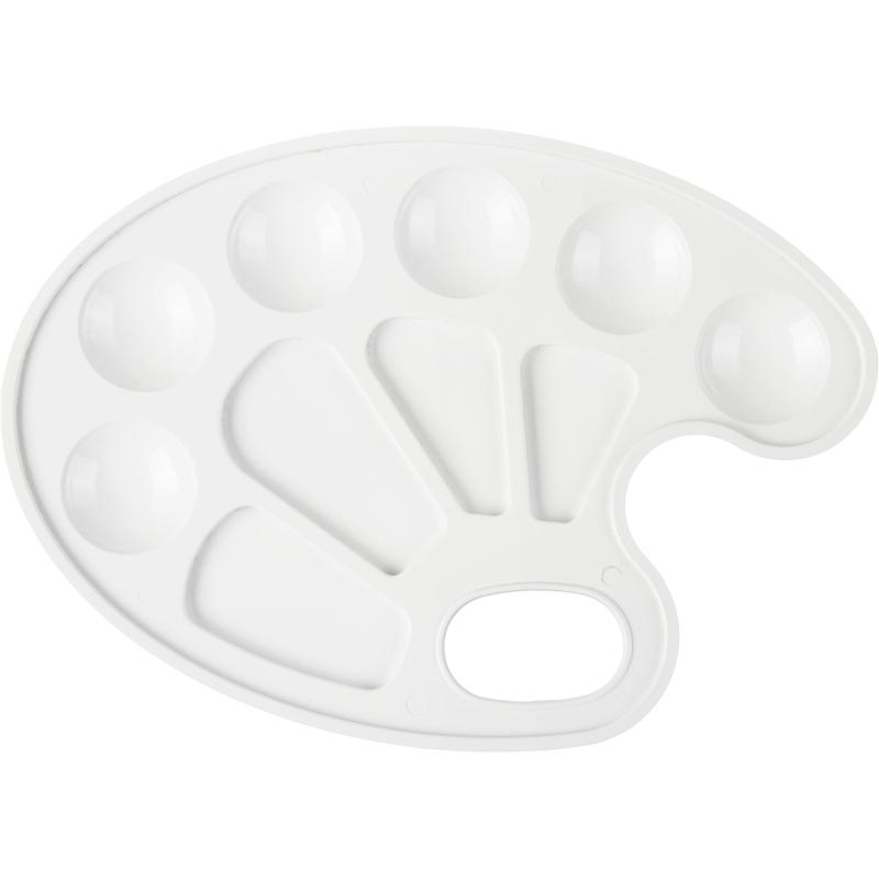 Палитра Комус Класс (№1 School) Отличник пластиковая овальная белая (с отделением для большого пальца, 6 отделений для красок, 4 отделения для смешивания)<br><br>Палитра используется для смешивания красок при рисовании. Овальная форма корпуса с отверстием для большого пальца обеспечивает удобный захват во время работы. Корпус изготовлен из пластика белого цвета. На поверхности расположено шесть отделений для красок и четыре отделения для смешивания, что позволяет подбирать нужные оттенки без использования дополнительных ёмкостей. Палитра остаётся лёгкой и устойчивой к воздействию влаги благодаря материалу изготовления. Размер изделия составляет 220x157 мм.