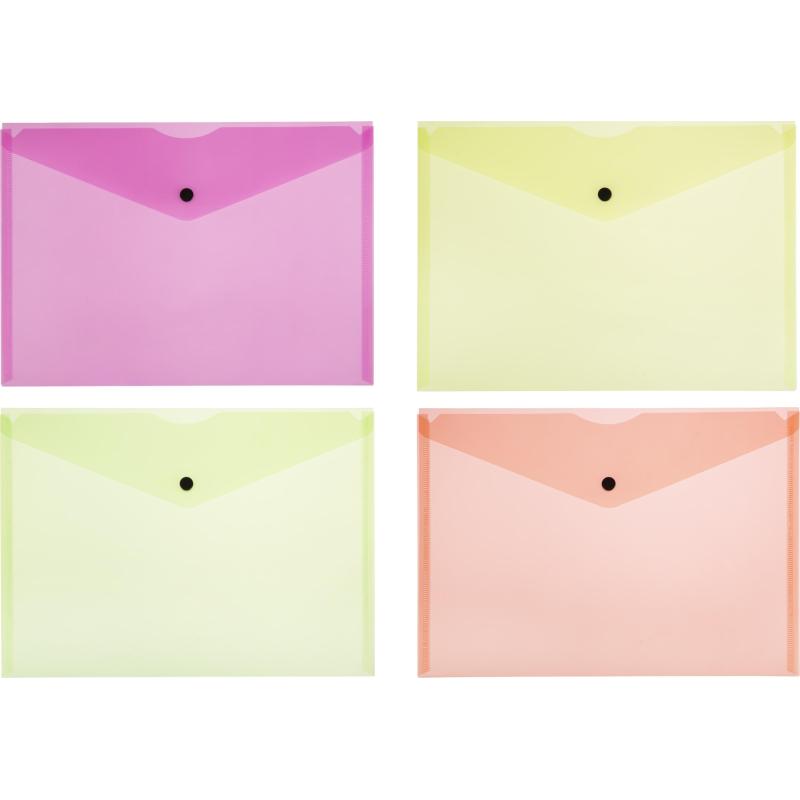 <nobr>Папка-конверт</nobr> формата А4 изготовлена из пластика толщиной 0.18 мм. Закрывается на кнопку. Вмещает до 120 листов.<BR>Удобна для хранения и переноски документов, предотвращает их смятие и загрязнение. Размер папки — 340×240 мм.<BR>Поставляется упаковками по 8 папок четырех цветов в упаковке. Цвета папок в упаковке — оранжевый, желтый, салатовый, розовый.