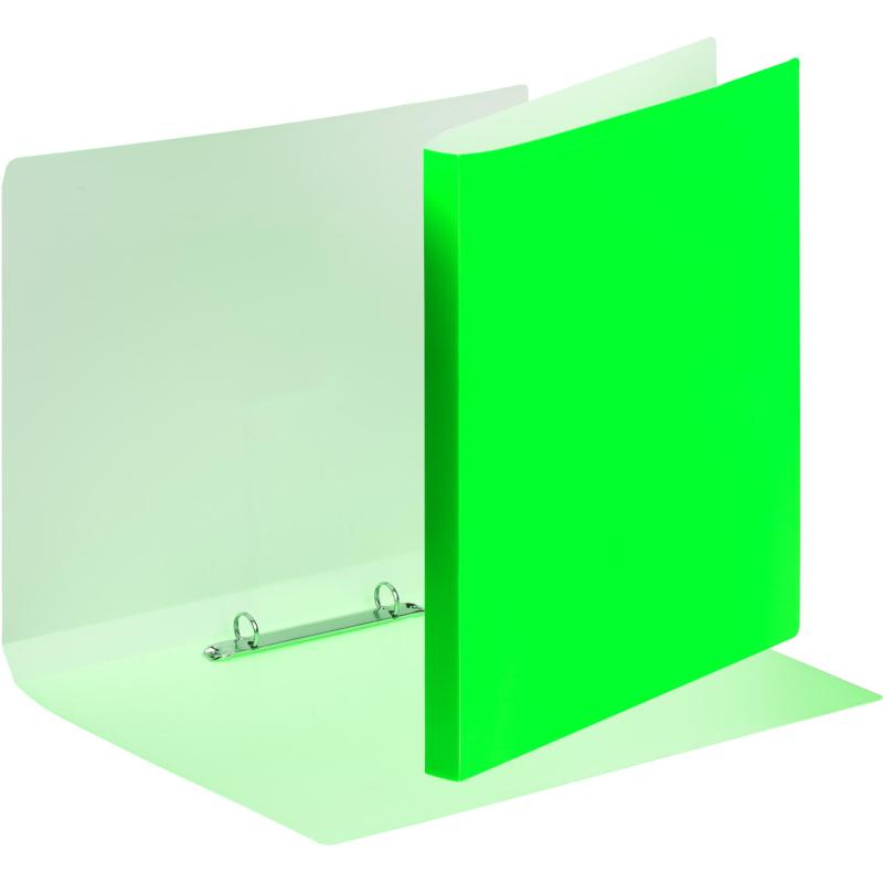 Папка на кольцах изготовлена и полипропилена толщиной 500 мкм. Вмещает до 150 листов бумаги формата А4. Цвет салатовый. Ширина корешка — 18 мм.