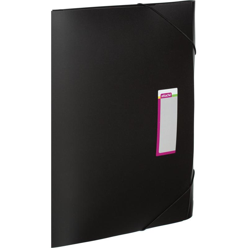 Папка-короб на двух резинках Attache формата А3 выполнена из пластика, толщиной 0,8 мм, черного цвета. Оснащена двумя угловыми резинками, которые надежно удерживают ее в закрытом состоянии. Имеет три боковых клапана, благодаря чему документы не выпадают. Вмещает до 300 листов стандартной плотности. На обложке — этикетка для маркировки.