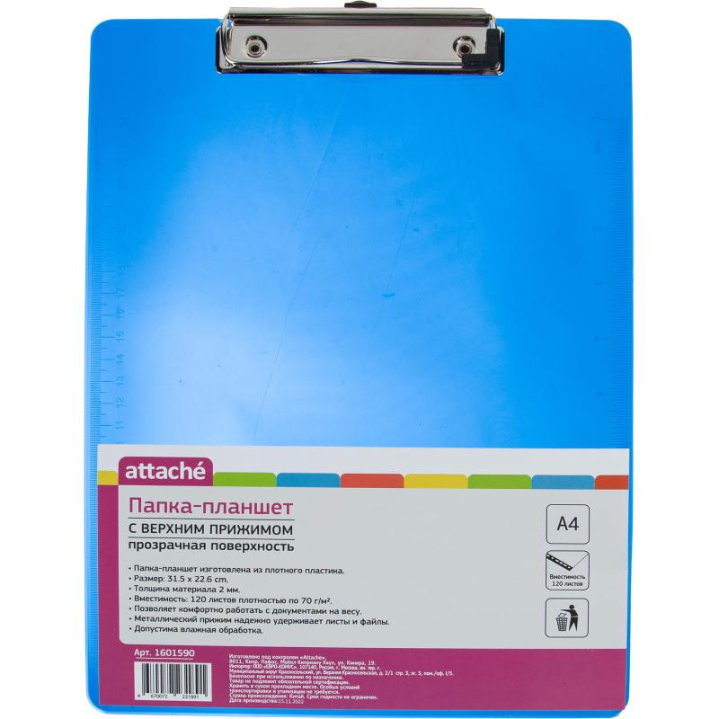 <nobr>Папка-планшет</nobr> Attache формата А4 изготовлена из плотного пластика (полипропилена) полупрозрачного синего цвета. Толщина материала — 2 мм. Позволяет комфортно работать с документами на весу. Металлический прижим надежно удерживает листы и файлы. С двух сторон по краям линейка. Имеет линейку для измерения в сантиметрах (25 см и 10 см), идеально подходит для измерения на ходу.<BR>