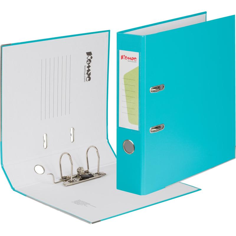 Папка-регистратор ’Комус’ из коллекции ’Экономи’ с арочным механизмом подходит для хранения большого количества документов формата А4. Изготовлена из плотного картона, который покрыт пластиком (бумвинилом) бирюзового цвета. Нижние края защищены от повреждений металлическим кантом. На корешке шириной 75 мм есть карман со сменной этикеткой и кольцо для захвата. Арочный механизм произведен в Чехии. Папка-регистратор вмещает до 480 листов стандартной плотности.<br> <br> Папки-регистраторы незаменимы в офисах, государственных учреждениях и домах, где необходимо хранить и систематизировать множество документов. Они способствуют поддержанию порядка и обеспечивают легкий доступ к необходимой информации. Папка бирюзового цвета может использоваться в системе цветовой кодировки для упорядочивания документов.