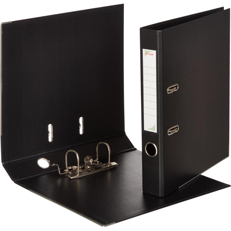 Папка-регистратор ’Комус’ из коллекции ’Стандарт’ изготовлена из картона, с внешней и внутренней стороны оклеена полипропиленовой пленкой черного цвета. Формат А4. Арочный механизм произведен в Чехии. Нижние края защищены от повреждений металлическим кантом. Благодаря прорезям для колец на внешней крышке папка остается закрытой даже при большом количестве бумаг. На корешке шириной 50 мм есть карман со сменной этикеткой и кольцо для захвата. Папка-регистратор ’Комус’ вмещает до 320 листов стандартной плотности.<br> <br> Папка-регистратор — незаменимый инструмент для систематизации и хранения большого количества документов в офисе, государственном учреждении и дома.