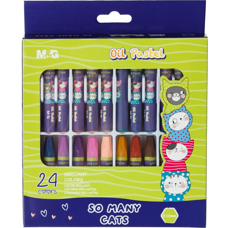 Пастель масляная M&G шестигранная 24 цвета<br> <br> Масляная пастель M&G с шестигранной формой включает 24 ярких цвета. Каждый мелок обёрнут бумагой для предотвращения загрязнения рук. Пастель характеризуется мягким нанесением, высокой укрывистостью и хорошей смешиваемостью. Упаковка — картонная коробка с европодвесом. Размер упаковки составляет 164×20×198 мм. Длина мелка — 74 мм, ширина — 10 мм.