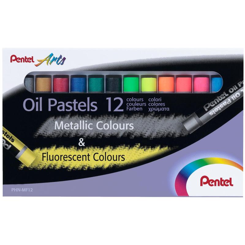 Пастель масляная Pentel Arts круглая 12 цветов<br> <br> Масляная пастель Pentel PHN-MF12 состоит из 12 цветов, включая 6 флуоресцентных и 6 металлических оттенков. Пастель обладает мягкой текстурой, что обеспечивает лёгкость нанесения. Подходит для рисования на бумаге, картоне, холсте и керамике. Мелки не крошатся благодаря качественным материалам и современным технологиям производства. Устойчивы к воздействию света.<br> <br> Каждый мелок имеет индивидуальную бумажную обёртку для защиты рук. Набор упакован в картонную коробку, размеры упаковки — 135×15×85 мм. Длина мелка — 60 мм, ширина — 8.5 мм.