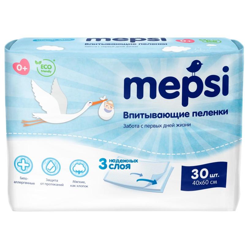 Пелёнки впитывающие одноразовые Mepsi 40×60 см (30 штук в упаковке)<br><br>Одноразовые пелёнки Mepsi обеспечивают комфорт мамы и малыша при пеленании, кормлении, а также когда ребёнок находится без подгузников. Пелёнки Mepsi берегут ваши кроватки, коляски и другие поверхности. Одноразовые пелёнки Mepsi изготовлены из гипоаллергенных, мягких и безопасных для малышей материалов, способны быстро поглощать жидкость и удерживают её, благодаря впитывающему слою.<br>Состав: нетканый гипоаллергенный материал, 100% распушённая целлюлоза, полиэтилен.<br>Страна производства: Россия.