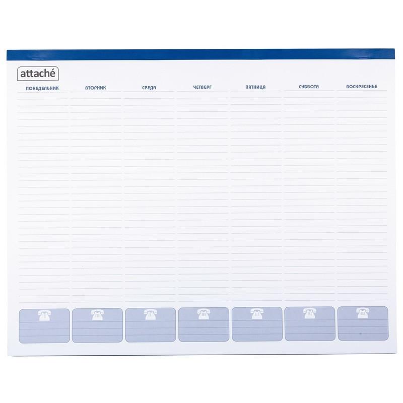 Планинг недатированный Attache предназначен для эффективного планирования рабочего, учебного и личного времени. Он позволяет удобно зафиксировать информацию о предстоящих встречах, совещаниях и прочих событиях. Обложка отсутствует. Планинг выполнен в универсальном офисном стиле. Тип крепления — склейка. Внутренний блок сделан из офсетной бумаги плотностью 80 г/кв.м, имеет перфорацию. На одном листе помещаются записи и даты на одну неделю. Информационно-справочный блок содержит пространство для внесения личных данных и ведения заметок. Размеры изделия составляют 575×450 мм.