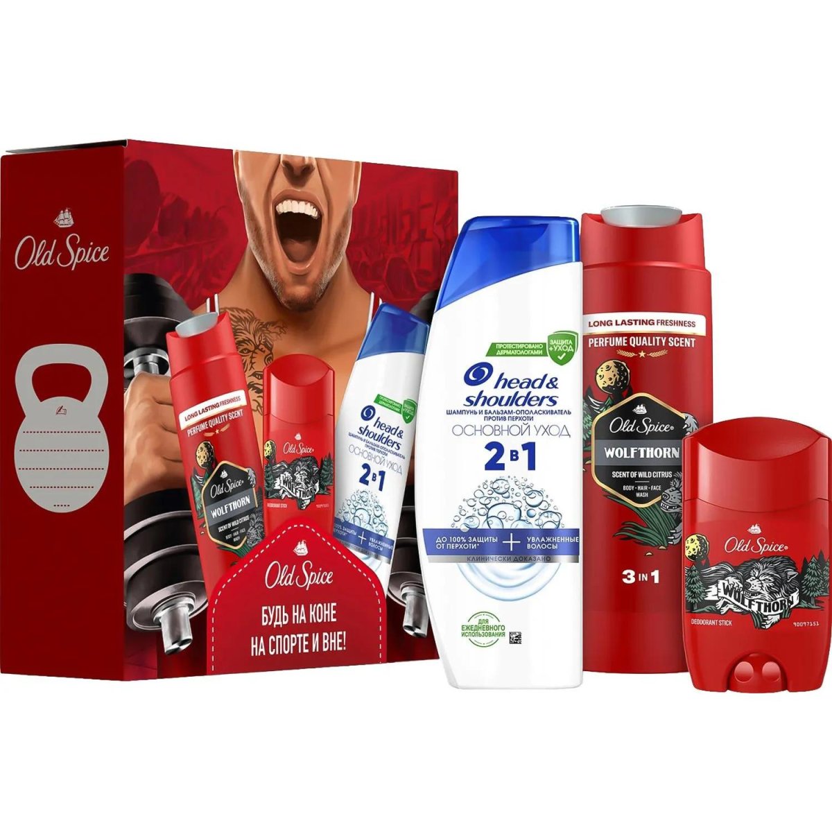 Подарочный набор косметики для мужчин Old Spice<br><br>Подарочный набор косметики создан для комплексного мужского ухода за телом и волосами. Средства обеспечивают очищение, свежесть и защиту, помогая сохранить уверенность и ощущение комфорта в течение всего дня.<br><br>Состав набора:<br>Дезодорант-стик Old Spice Wolfthorn 50 мл — обеспечивает надёжную защиту от запаха, обладает ароматом с нотами цитрусов, придаёт стойкое чувство свежести и уверенности;<br>Гель для душа Old Spice Wolfthorn 250 мл — образует густую пену, эффективно очищает кожу, дарит ощущение бодрости и энергии;<br>Шампунь Head & Shoulders Основной уход 2 в 1 200 мл — мягко очищает кожу головы и волосы, помогает избавиться от перхоти и придаёт волосам здоровый вид.<br><br>Набор подойдёт для мужчин, предпочитающих свежесть и практичность. Он сочетает уход за телом и волосами с ярким ароматом, подчёркивающим мужественность и уверенность.