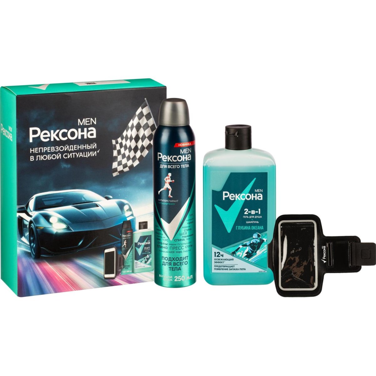 Подарочный набор косметики для мужчин Rexona (для тела/для волос)<br><br>Подарочный набор косметики для мужчин уверенности включает три предмета: гель для душа и шампунь 2 в 1, дезодорант-спрей и спортивный чехол для телефона. Средства собраны в подарочную упаковку и подойдут для ежедневного использования.<br>Гель для душа и шампунь 2 в 1 содержит пребиотический комплекс с глицерином, инулином и молочной кислотой. Он очищает волосы, кожу головы и тела, придаёт ощущение свежести и увлажнённости. Средство предотвращает появление запаха до 12 часов и оставляет стойкий древесно-мускусный аромат.<br>Дезодорант-спрей создан для защиты тела от пота и запаха в течение всего дня. Он не содержит спирта, не вызывает раздражения кожи и не оставляет следов на одежде. Аромат с нотами лайма, зелени и морской соли дарит ощущение бодрости и прохлады.<br><br>Дополняет набор удобный чехол для смартфона, который можно использовать во время занятий спортом или прогулок.