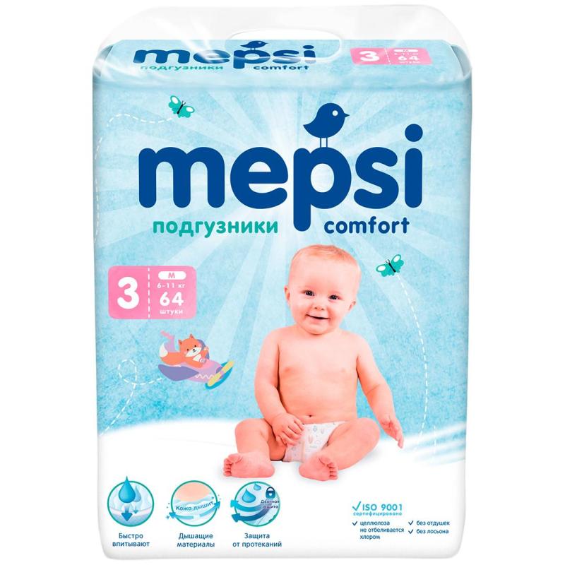 Подгузники для детей Mepsi 6-11 кг (64 штуки в упаковке)<br><br>Подгузники Mepsi производятся в России с учётом инновационных технологий в области детской индустрии. Комфортные, антиаллергенные, созданные для самых чувствительных малышей подгузники Mepsi — для любящих и заботливых родителей:<br>— дышащий внешний слой изготовлен из воздухопроницаемого материала, что создаёт идеальный микроклимат внутри подгузника;<br>— сверхмягкий внутренний слой с рельефным покрытием изготовлен из нетканого гипоаллергенного материала, идентичного натуральному хлопку;<br>— слой ADL моментально и равномерно распределяет жидкость во впитывающую сердцевину;<br>— впитывающая сердцевина, изготовленная из супер абсорбента и распушённой целлюлозы, надёжно удерживает влагу внутри;<br>— эластичный пояс с многоразовыми липучками надёжно фиксирует подгузник на теле малыша, не ограничивая свободу передвижения;<br>— анатомический крой подгузников хорошо повторяет контур тела малыша и надёжно снабжён сверхнежными эластичными бортиками, что обеспечивает дополнительный комфорт малышу;<br>— индикатор влаги заботливо подскажет, что подгузник пора сменить.<br>Состав: супер абсорбирующий полимер, распущенное целлюлозное волокно, нетканый полиэстер, лайкровые нити, термоклей, полипропиленовый пояс, бумага, воздухопроницаемая плёнка.