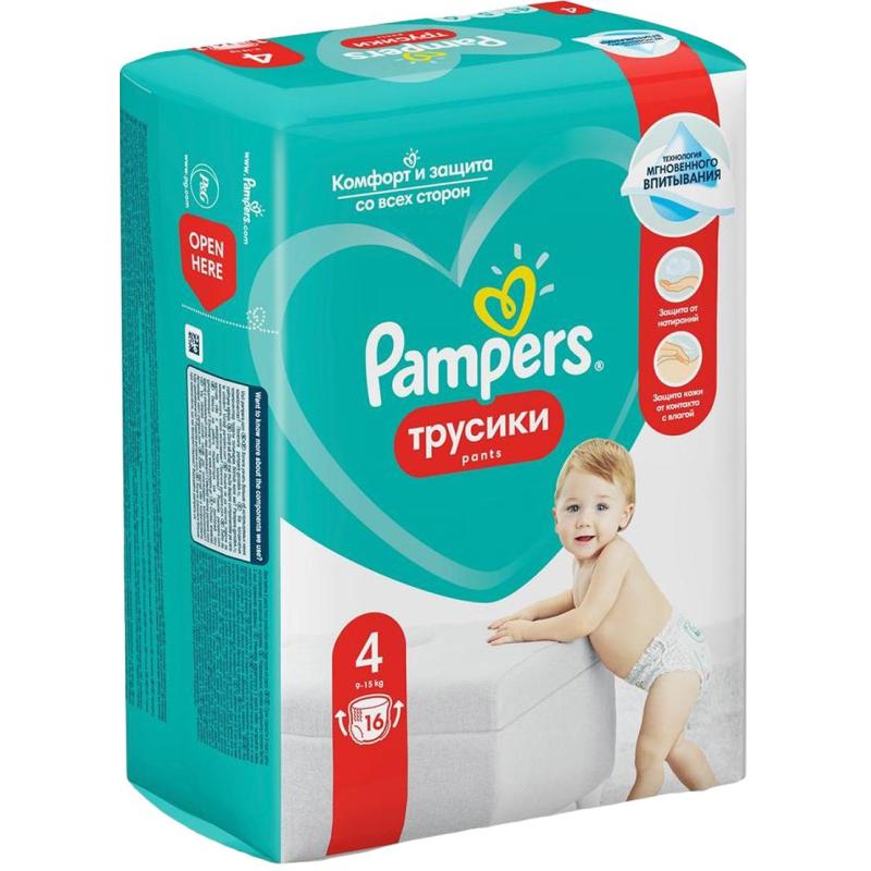 Подгузники-трусики для детей Pampers 9-15 кг (16 штук в упаковке)<br><br>Вы заботитесь о нежной коже малыша и хотите, чтобы в трусиках малышу было по-настоящему комфортно? Попробуйте трусики Pampers Pants с анатомической посадкой! Супермягкий эластичный поясок нежно прилегает к животику, мягкие бортики вокруг ножек помогают защитить нежную кожу малыша от натираний, а технология мгновенного впитывания удерживает влагу внутри, обеспечивая сухость до 12 часов — как днём, так ночью. Трусики Pampers легко надевать и снимать, так что активные малыши смогут продолжать изучать мир вокруг, не отвлекаясь на смену трусиков! А когда трусики понадобится поменять, просто разорвите их по боковому шву!<br>Преимущества:<br>— Анатомическая посадка для комфорта кожи и защиты со всех сторон.<br>— Супермягкий эластичный поясок нежно прилегает к животику.<br>— Мягкие бортики вокруг ножек помогают предотвратить натирания.<br>— Технология мгновенного впитывания удерживает влагу внутри.<br>— Проверенная сухость Pampers до 12 часов.<br>— Индикатор влаги подсказывает, когда трусики пора менять.<br>— Легко надевать, удобно снимать — просто разорвите по боковому шву!