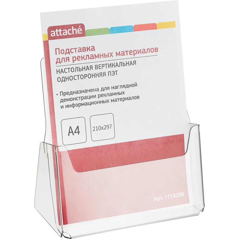 Вертикальная односторонняя настольная подставка Attache формата А4. Поставляется в защитной пленке. Вмещает стопку информационных материалов толщиной до 32 мм. Имеет низкий борт для легкого излечения брошюр или листовок. Материал — бесцветный ПЭТ ударопрочный. В упаковке 1 подставка. Размеры изделия (ВxШxГ): 235×215×110 мм.
