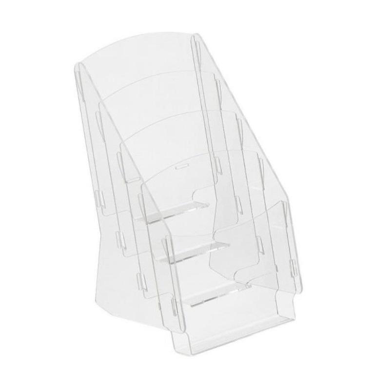 Вертикальная односторонняя настольная подставка со смещением предназначена для размещения буклетов и прочих информационных материалов в местах продаж, офисах, учреждениях. Изготовлена из прозрачного акрилового стекла. Имеет 4 отделения формата 1/3 А4. Внутренние размеры отделения: 115×23 мм. Размеры подставки: 120×140×220 мм. Вес: 30 г.
