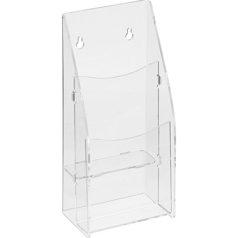 <p>Вертикальная односторонняя подставка. Предназначена для размещения бумажнопечатной продукции формата 1/3 А4. Может использоваться как настольный вариант, так и подвесной, имеет отверстия для подвеса. Изготовлена из прозрачного акрила. В одной упаковке товара содержится 1 изделие. Поставляется в защитной пленке. Размер поля: 210×105 мм. Размеры (ВxШxГ): 250×110×75 мм.</br></br></p>