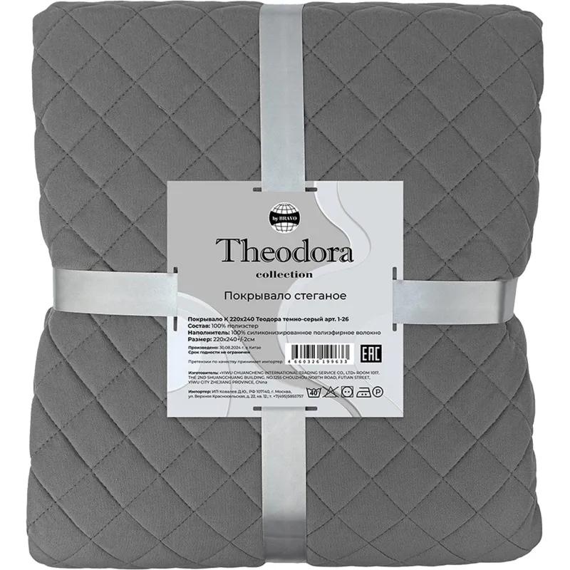 Покрывало Theodora вельвет 220×240 см тёмно-серое<br><br>Стёганое покрывало из 100% полиэстера выполнено из трикотажной ткани с густым ворсом и узкими продольными рубчиками вельвета. Материал прочный и приятный на ощупь, отличается износостойкостью и простотой ухода.<br><br>В наполнителе используется силиконизированное полотно, которое сохраняет форму и объём при эксплуатации.<br><br>Плотность 360 г/кв.м обеспечивает комфортное сочетание лёгкости и тепла. Такое покрывало предназначено для дома и создаёт уютную атмосферу в спальне.<br><br>Рекомендации по уходу:<br><br>— Стирка: изделия стирать с нейтральными моющими средствами в тёплой воде при температуре до 40°С.<br><br>— Подходит для тёмных, цветных и пёстрых изделий из хлопка, полиэстеровых и меланжевых тканей, а также для тонкого белья из вискозы и синтетических волокон.<br><br>— Отбеливание: не отбеливать, не использовать хлорсодержащие моющие средства и порошки с отбеливателями.<br><br>— Сушка: сушить при средней температуре.<br><br>— Глажка: гладить при температуре подошвы утюга до 150°С.<br><br>— Химчистка: допускается чистка с использованием углеводорода, хлорного этилена или монофлотрихлорметана.<br><br>Тип упаковки: сумка ПВХ.