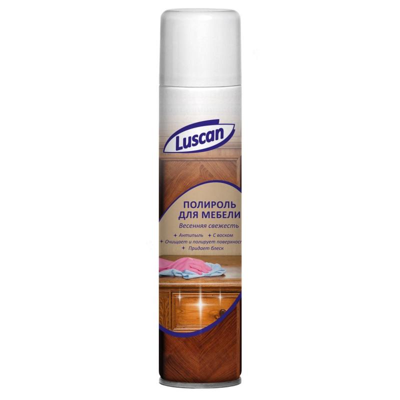 <b>Полироль для мебели Luscan с воском 300 мл.</b><br> <b>Назначение:</b> средство предназначено для ухода за домашней и офисной мебелью, деревянными, лаковыми и пластмассовыми покрытиями, также оргтехникой. Средство придает блеск и антистатические свойства внешним и внутренним деревянным, пластиковым и резиновым поверхностям, эффективно очищает их от пыли, жира, масла и других загрязнений, предотвращает процесс старения.<br> <b>Способ применения:</b> хорошо встряхнуть баллон и равномерно распылить полироль на обрабатываемую поверхность с расстояния 15–20 см, после чего протереть до блеска сухой мягкой тканью. Применять при температуре не ниже плюс 10 °С.<br><b>Меры предосторожности:</b> использовать только по назначению! Баллон под давлением! Не распылять вблизи открытого огня и раскаленных предметов! Предохранять от воздействия прямых солнечных лучей и нагревания выше 40 °С! Не допускать попадания в глаза, при попадании — промыть водой. При попадании в рот — прополоскать водой. Не курить во время применения! Хранить в недоступных для детей местах! Не нарушать целостности упаковки и не сжигать, даже после использования. Хранить при температуре от -20 °С до 40 °С. После использования утилизировать как бытовой отход.<br> <b>Состав:</b> вода, растворитель 15–30%, пропеллент углеводородный 15–30%, полиметилсилоксановая жидкость <5%, функциональные добавки <5%, антистатик <5%, воск <5%, отдушка <5%, <nobr>д-лимонен</nobr>, линалоол.<br> <b>Срок годности:</b> 36 месяцев.<br>