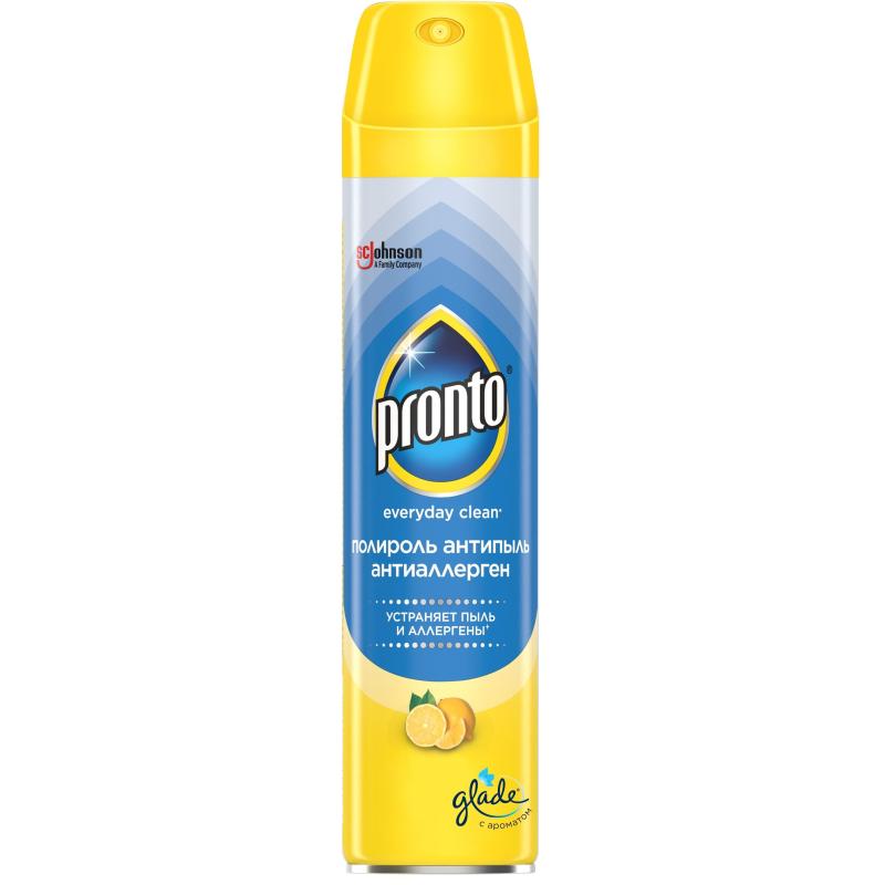 Полироль для мебели Pronto Антипыль и Антиаллерген, 250 мл Назначение: Средство для ухода за мебелью и прочими поверхностями. Удаляет пыль и аллергены, содержащиеся в пыли, с твердых поверхностей. Подходит для очищения деревянных, ламинированных, пластиковых, акриловых поверхностей, искусственного камня, мрамора и гладкой кожи. НЕ рекомендуется для очищения стекол и зеркал. НЕ использовать для полов и изделий из необработанного дерева. Способ применения: Хорошо встряхните перед использованием, держа баллон вертикально, распылите на поверхность с расстояния 15-20 см, протрите сухой чистой салфеткой. При очистке небольших поверхностей распылите средство на салфетку и протрите как обычно. Деревянные поверхности протирайте по направлению рисунка дерева. Перед применением протестируйте на незаметном участке. Меры предосторожности: Использовать только по назначению согласно инструкции. Не разбирать и не давать детям! Беречь от источников тепла, искр, открытого огня и других источников воспламенения. Не курить. Не распылять вблизи открытого огня или других источников воспламенения. Не нарушать целостности упаковки и не сжигать, даже после использования. Использовать только в хорошо проветриваемых помещениях. Не допускать попадания в глаза. После работы тщательно вымыть руки. При попадании в глаза: осторожно промыть глаза водой в течение нескольких минут. Снять контактные линзы, если Вы ими пользуетесь и если это легко сделать. Продолжить промывание глаз. Если раздражение глаз не проходит, обратиться за медицинской помощью. Избегать попадания в окружающую среду. Состав: Вода, ? 30 %: пропеллент (изобутан, пропан, бутан), ? 5 % но < 15 %: алифатические углеводороды, < 5 %: силиконовое масло, н-ПАВ, отдушка (цитронеллол, d-лимонен, гексилциннамаль, линалоол)xx, консервант. xx Потенциальные аллергены. Не содержит озоноразрушающих хладонов. Условия хранения: Хранить в сухом, недоступном для детей и домашних животных месте, при температуре от 0 до +35°C отдельно от пищевых продуктов. Беречь от солнечных лучей, избегать нагревания более 50°C. Срок годности: 2 года (с даты производства)