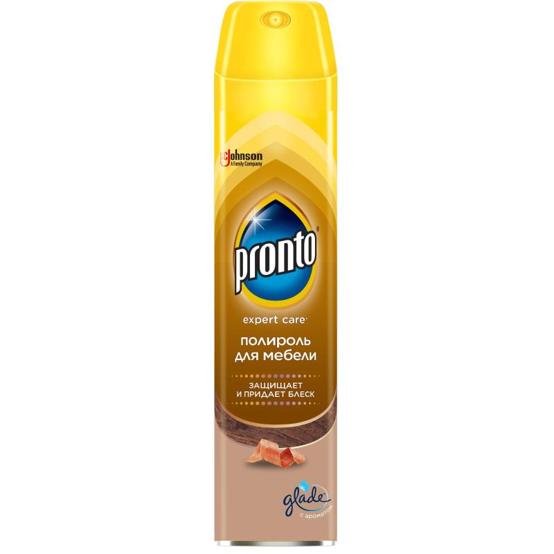 Полироль для мебели Pronto Для деревянных поверхностей, 250 мл Назначение: Средство для ухода за мебелью и прочими поверхностями. Удаляет пыль, следы от пальцев и другие загрязнения. Придает блеск, обеспечивает уход и защиту Вашей мебели, возвращая поверхностям естественную красоту. Подходит для очищения деревянных, ламинированных, пластиковых, акриловых поверхностей, искусственного камня, мрамора и гладкой кожи. НЕ рекомендуется для очищения стекол и зеркал. НЕ использовать для полов и изделий из необработанного дерева. Способ применения: Хорошо встряхните перед использованием, держа баллон вертикально, распылите на поверхность с расстояния 15-20 см, протрите сухой чистой салфеткой. При очистке небольших поверхностей распылите средство на салфетку и протрите как обычно. Деревянные поверхности протирайте по направлению рисунка дерева. Перед применением протестируйте на незаметном участке. Меры предосторожности: Использовать только по назначению согласно инструкции. Не разбирать и не давать детям! Беречь от источников тепла, искр, открытого огня и других источников воспламенения. Не курить. Не распылять вблизи открытого огня или других источников воспламенения, Не нарушать целостности упаковки и не сжигать, даже после использования. Использовать только в хорошо проветриваемых помещениях. Не допускать попадания в глаза. После работы тщательно вымыть руки. При попадании в глаза: осторожно промыть глаза водой в течение нескольких минут. Снять контактные линзы, если Вы ими пользуетесь и если это легко сделать. Продолжить промывание глаз. Если раздражение глаз не проходит, обратиться за медицинской помощью. Избегать попадания в окружающую среду. Состав: Вода, ? 30 %: пропеллент (изобутан, пропан, бутан), ? 5 % но < 15 %: алифатические углеводороды, < 5 %: силиконовое масло, н-ПАВ, отдушка (бензилсалицилат, линалоол)xx, консервант. xx Потенциальные аллергены. Не содержит озоноразрушающих хладонов. Условия хранения: Хранить в сухом, недоступном для детей и домашних животных месте, при температуре от 0 до +35°C отдельно от пищевых продуктов. Беречь от солнечных лучей, избегать нагревания более 50°C. Срок годности: 2 года (с даты производства)