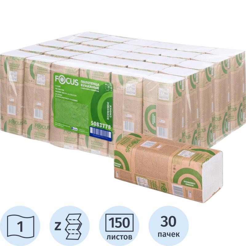 Полотенца бумажные листовые Focus H2 Z-сложение 1-слойные белые 30 пачек по 150 листов (5083778)<br><br>Полотенца имеют удобный формат листов. Их размер составляет 24×21,5 см. Они прекрасно впитывают влагу и подходят для диспенсеров с листовой подачей. Полотенца идеально подходят для использования в туалетных комнатах с высокой проходимостью. Благодаря качественному тиснению они обеспечивают высокий уровень гигиены. Полотенца белого цвета, без перфорации. Эти изделия являются практичным решением для поддержания чистоты в общественных и офисных туалетах. Изготовлены из 100% первичной целлюлозы. Белизна материалов составляет 85. Они не оставляют запахов и комфортно ощущаются в руках. <br>Полотенца поставляются в упаковках по 30 пачек, в каждой из которых 150 листов. <br>Всего в упаковке 4500 листов. <br>Размер каждой пачки — 8×21,5×9 см.