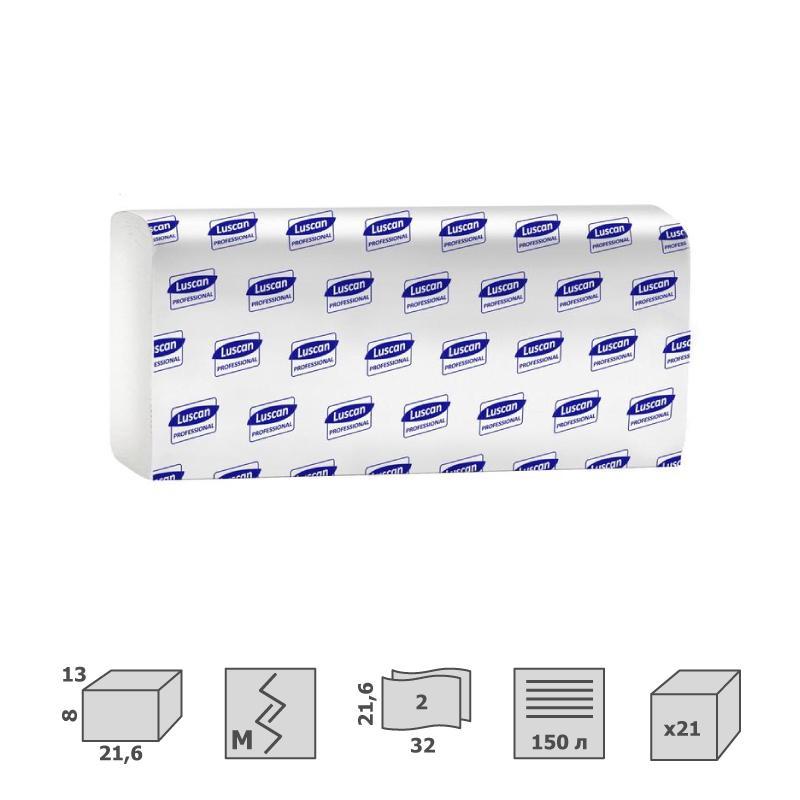 Полотенца бумажные листовые Luscan Professional H2 М-сложение 2-слойные белые 21 пачка по 150 листов<br><br>Двухслойные листовые бумажные полотенца LuscanProfessional M-сложения белого цвета с тиснением и перфорацией. Тип сложения и полистовая подача полотенец обеспечивают гигиеничность и экономичный расход. Подходят для ресторанов, офисов и учреждений здравоохранения. Рекомендуются для использования в местах с низким и средним уровнем проходимости. Изготовлена из вторичного сырья. <br>Размер пачки: 21,6×8x13 см. Размер листа: 32×21,6 см. <br>Поставляются упаковками из 21 пачки по 150 листов.