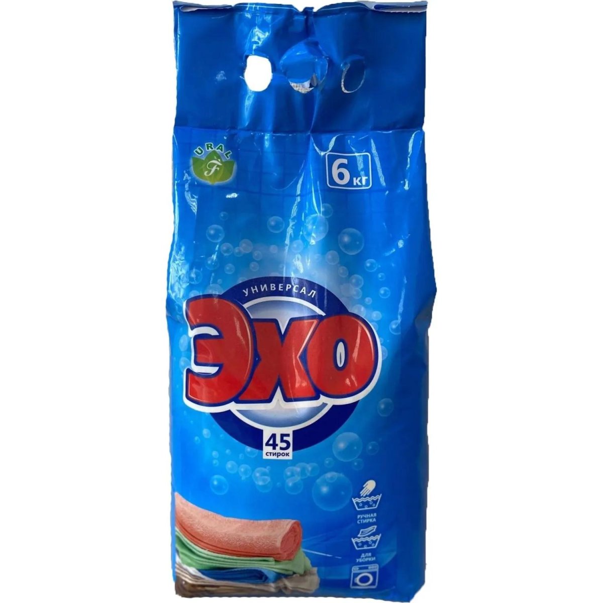 Порошок стиральный автомат Флора Эхо 6 кг для белого и цветного белья<br><br><b>Назначение:</b> средство для замачивания и стирки из хлопчатобумажных, льняных, искусственных и смешанных волокон.<br><b>Способ применения:</b> стирка в машинах активаторного типа тем. 40-95 С расход на 3 кг = 100-130 гр, для эффективности, порошок засыпать непосредственно в барабан. Ручная стирка 40-50 С расход на 2 кг (10 л воды) = 50-70 гр. Замачивание 40-50 С расход 10 л = 30-40 гр. Продолжительность 3 часа. Влажная уборка 20-50С Расход 10 л = 15-25 гр. Светлые изделия стирать отдельно от тёмных и цветных. Для сильно загрязнённого белья и жёсткой воды увеличьте дозировку порошка. Следуйте рекомендациям на ярлыках одежды при выборе условий стирки и температуры. Для изделий из шёлка и шерсти используйте специальные моющие средства.<br><b>Меры предосторожности:</b> беречь от детей! При попадании в глаза промыть большим количеством воды.<br><b>Состав: </b> анионные ПАВ менее 5%, сульфат натрия более 30%, хлорид натрия 5% или более, но не менее 3%, КМЦ менее 5%, силикат натрия менее 5%, ТПФ более 5%, сода кальцинированная более 5%, оптический отбеливатель менее 5%, ароматизирующая добавка менее 5%, натуральное мыло.<br><b>Условия хранения:</b> хранить отдельно от пищевых продуктов в плотно закрытой таре!<br><b>Срок годности:</b> 36 месяцев с даты производства.