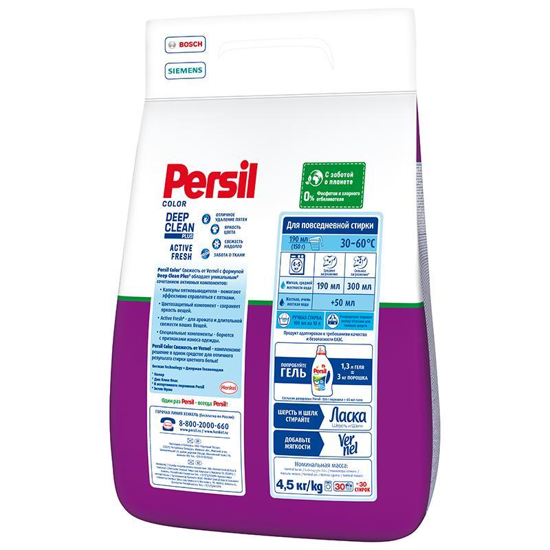 Порошок стиральный автомат Персил Свежесть от Вернель 4.5 кг для цветного белья<br><br><b>Назначение:</b> стиральный порошок Persil Color Freshness by Vernel предназначен для цветного белья. Средство Персил содержит формулу Deep Clean Technology с уникальным сочетанием 13 активных компонентов, это обеспечивает высокую эффективность стирки. <br>— Порошок Persil Color тщательно отстирывает цветные вещи и удаляет самые различные пятна. <br>— Средство дарит белью приятный аромат и длительную свежесть. <br>— Порошок для стирки Persil заботится о ткани и возвращает вещам яркость красок.<br>Таким образом, порошок для стирки белья Persil комплексно решает все проблемы чистоты и свежести белья.<br><br><b>Способ применения:</b> насыпьте необходимое количество порошка в соответствующее отделение стиральной машины перед началом стирки. Подробная информация о дозировке указана на упаковке.<br><br><b>Меры предосторожности:</b> беречь от детей. Избегать попадания в глаза. При попадании в глаза — немедленно промыть проточной водой. Не глотать. При проглатывании обратитесь за медицинской помощью. Хранить вдали от пищевых продуктов. При повышенной чувствительности и повреждениях кожи избегать длительного контакта с любыми средствами для стирки.<br><br><b>Состав:</b> 5-15 % анионных ПАВ; более 5 % неионогенных ПАВ, поликарбоксилатов, фосфонатов, мыла, энзимов, отдушки.<br><br><b>Условия хранения:</b> хранить в недоступном для детей месте.<br><br><b>Срок годности:</b> 36 месяцев с даты производства.