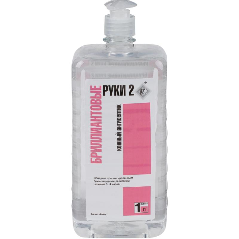 Дезинфицирующее средство (антисептик) Бриллиант Бриллиантовые руки-2 1 л<br><br><b>Назначение:</b> Средство предназначено для использования: В качестве кожного антисептика для: — обработки рук хирургов, оперирующего медицинского персонала в лечебно-профилактических организациях (ЛПО), включая хирургические, терапевтические, акушерско-гинекологические; — обработки локтевых сгибов доноров на станциях переливания крови и др.; — гигиенической обработки рук медицинского персонала в медицинских, лечебно-профилактических организациях (ЛПО) в медико-санитарных частях, работников аптек и аптечных заведений; — гигиенической обработки рук медицинских работников детских дошкольных и школьных учреждений, учреждений соцобеспечения (домах престарелых, инвалидов и др.), работников парфюмерно-косметических предприятий, на предприятиях химико-фармацевтической и биотехнологической промышленности, на объектах коммунально-бытовых служб (в т.ч. парикмахерских, косметических салонов, салонов красоты, СПА-салонов, банно-прачечных комплексов, объектов гостиничного хозяйства и пр.), объектов служб ритуальных услуг, санаторно-курортных учреждений, общественного транспорта, на предприятиях общественного питания, молочной кухни, рынков, на предприятиях пищевой и перерабатывающей промышленности, птицеводческих, животноводческих, свиноводческих и звероводческих хозяйств, предприятий торговли (в т.ч. кассиров и других лиц, работающих с денежными купюрами); — частичной санитарной обработки кожных покровов, в том числе ступней ног с целью профилактики грибковых заболеваний после посещения объектов спортивно-оздоровительного профиля (бассейны, бани, сауны, фитнес-центры). В качестве дезинфицирующего средства с целью дезинфекции различных твёрдых поверхностей, предметов, устойчивых к действию спиртов; — в медицинских, лечебно-профилактических организациях (ЛПО); — на предприятиях химико-фармацевтической и биотехнологической промышленности, в зонах чрезвычайных ситуаций; на объектах коммунального хозяйства (парикмахерские, СПА-салоны, гостиницы, общежития и пр.), общественного транспота, спортивно-оздоровительных учреждений, на предприятиях общественного питания, торговли, а именно для: — дезинфекции небольших по площади или труднодоступных поверхностей в помещениях (пол, стены и др.); жёсткой и мягкой мебели (в т.ч. матрасов, подголовников, подлокотников, стульев, кроватей, столов, гинекологических и стоматологических кресел и др.); осветительной аппаратуры, жалюзи, радиаторов отопления, дверных и оконных ручек, решёток кондиционеров и т.п.; напольных ковровых покрытий, обивочных тканей; — дезинфекции оборудования в клинических, микробиологических, вирусологических и других лабораториях, в т.ч. предметных стёкол (очистка от иммерсионного масла); — обеззараживания перчаток (из латекса, изопрена, нитрила и других материалов, устойчивых к воздействию химических веществ); — дезинфекции предметов ухода за больными (из пластика, стекла, металла и др.), носилок, каталок, игрушек, спортинвентаря и пр.; — дезинфекции телефонных аппаратов, мониторов, компьютерной и офисной техники (кроме ЖК-экранов); — дезинфекции соляриев и ламп для соляриев; — дезинфекции ковриков из резин и полимерных материалов; — дезинфекции внутренней поверхности обуви для