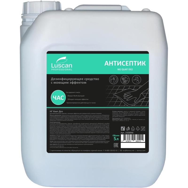 Дезинфицирующее средство (антисептик) Luscan Professional NG Quat Dez на основе ЧАС 5 л<br><br><b>Назначение:</b> для антисептической обработки рук и поверхностей. Обладает моющим эффектом. Не содержит спирта.<br>Область применения: предназначено для дезинфекции и мойки поверхностей и технологического оборудования в производственных помещениях на предприятиях пищевой и перерабатывающей промышленности, на всех объектах направлении HoReCa, торговли и коммунально-бытового хозяйства. Для экспресс-обработки скорлупы яиц, кухонного оборудования и инвентаря (доски разделочные, ножи, мясорубки и др.), посуды, столовых приборов. Применимо в качестве кожного антисептика.<br><br><b>Способ применения:</b><br>— В качестве дезинфицирующего средства: дезинфекция осуществляется однократной обработкой способом протирания или орошения. Поверхности орошают средством для полного смачивания с расстояния 30 см.<br>— В качестве моющего средства: использовать в виде водного раствора из расчёта концентрации от 0.3% до 8%. Обработать загрязнённую поверхность, при необходимости применить механическое воздействие щёткой или ПАДом. Обеззараживание скорлупы яиц проводят 0.3% раствором средства с температурой (18 ± 2)°С на 10 минут. После дезинфекции яйца тщательно промывают проточной водой в течение 3 минут, оставляют для стекания на 15-20 минут.<br>— В качестве кожного антисептика: перед применением средства кисти рук/предплечья предварительно тщательно промыть тёплой водой и мылом, затем высушить. После нанести концентрат средства на сухие кисти рук (2-3 мл.) и втирать в кожу до полного высыхания.<br>Активность: обладает антимикробной активностью в отношении бактерий, вирусов (гепатитов, рота- и норо- вирусов, коронавирусов, ВИЧ, гриппа типа А, в т.ч. H5N1, H1N1, аденовирусов и др. ОРВИ, герпеса, цитомегалии и др.) грибов рода Кандида, дерматофитов; а также овоцидными свойствами в отношении возбудителей паразитных заболеваний (инвазий), в т.ч. в отношении цист и ооцист простейших, яиц и личинок возбудителей кишечных гельминтозов.<br><br><b>Состав:</b> подготовленная вода, смесь четвертичных аммониевых соединений: алкилдиметилбензиламмоний хлорид ≤8% и дидецилдиметиламмония хлорид ≤2%, неиногенное ПАВ, лаурет, изотридецет, краситель 0.01%, отдушка.<br><br><b>Условия хранения:</b> хранить в заводской упаковке, плотно закрытым, при температуре от +5 °С до +30 °С, вдали от источников тепла, избегая попадания прямых солнечных лучей, отдельно от пищевых продуктов, в местах недоступных для детей и животных.<br><br><b>Срок годности:</b> 60 месяцев при соблюдении условий хранения рекомендованных производителем.