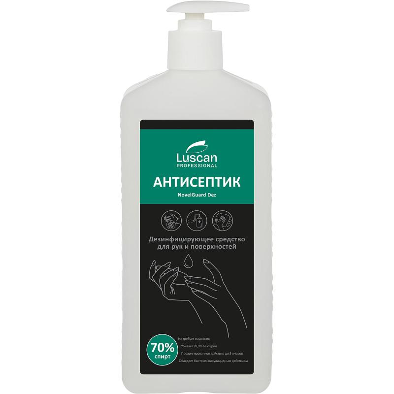 Дезинфицирующее средство (антисептик) Luscan Professional NovelGuard Dez на спиртовой основе 1 л<br><br><b>Назначение:</b> для антисептической обработки рук и поверхностей. Не требует смывания. Обладает быстрым вирулицидным действием.<br>Область применения: применяется на объектах сферы обслуживания и коммунально-бытового хозяйства (парикмахерские, салоны, гостиницы, общежития, учреждения соцобеспечения), на предприятиях химикофармацевтической отрасли, пищевой промышленности, в ЛПУ, в детских учебных учреждениях, на предприятиях общественного питания и торговли, в ветеринарных учреждениях.<br><br><b>Способ применения:</b><br>— В качестве кожного антисептика: перед применением средства кисти рук/предплечья предварительно тщательно промыть тёплой водой и мылом, затем высушить. После нанести средство на сухие кисти рук (2-3 мл.) и втирать в кожу до полного высыхания.<br>— В качестве дезинфицирующего средства: дезинфекция осуществляется однократной обработкой способом протирания или орошения. Поверхности орошают средством для полного смачивания с расстояния 30 см.<br>Активность: обладает антимикробной активностью в отношении вирусов (в т.ч. рино-, норо-, рото-, аденовирусов, короновирусы, вирусов энтеральных и парентеральных гепатитов, включая гепатиты А, В и С, ВИЧ, вирусов гриппа, в т.ч. «свиного» H1N1 и «птичьего» H5N1, вирусов «атипичной пневмонии» (SARS), герпеса, кори, возбудителей ОРВИ, цитомегаловирусной инфекции и т.д.), бактерий (включая микровирус туберкулёза, ВБИ, особо опасных инфекций — чума, холера, туляремия), в т.ч. спорообразующих, дрожжеподобных грибов и дрожжей, плесневых грибов, спор бацилл.<br><br><b>Меры предосторожности:</b> не проглатывать. При попадании на слизистые промыть большим количеством воды. При необходимости обратиться к врачу.<br><br><b>Состав:</b> изопропиловый спирт 70.0 ± 2.0% подготовленная вода, КПАВ, глицерин, комплекс эмолентов, активные добавки.<br><br><b>Условия хранения:</b> хранить в плотно закрытой оригинальной упаковке производителя, при температуре от +5 °С до +30 °С в тёмном сухом недоступном для детей и животных месте, отдельно от пищевых продуктов. Не допускать замораживания и попадания прямых солнечных лучей.<br><br><b>Срок годности:</b> 66 месяцев при соблюдении условий хранения рекомендованных производителем.