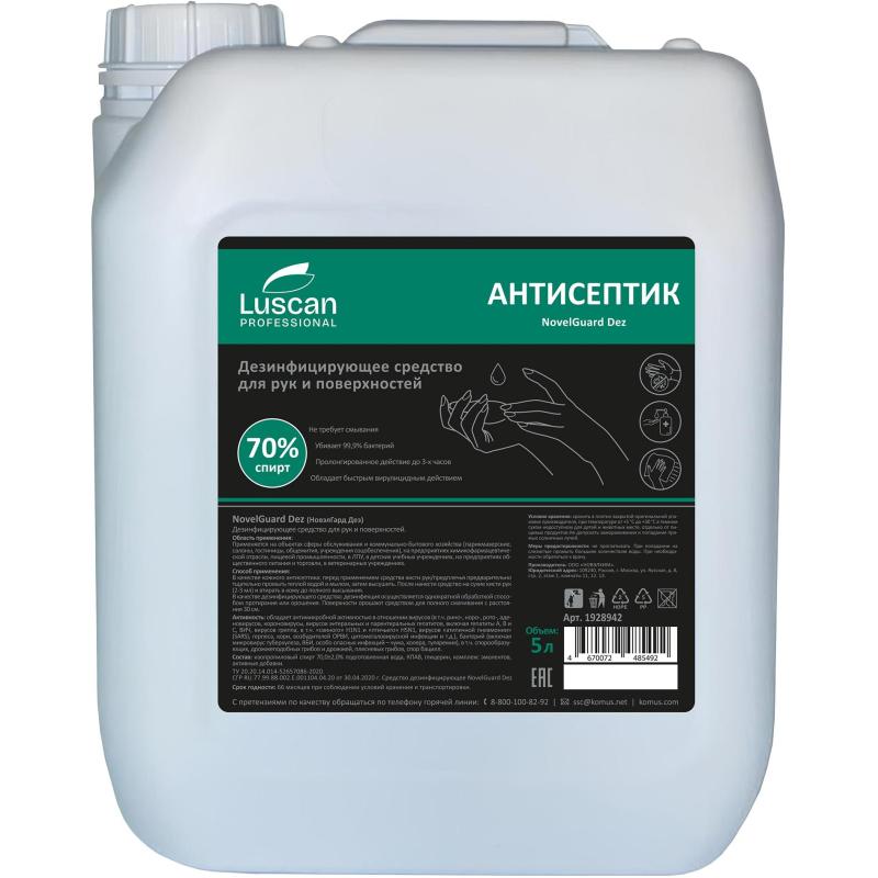 Дезинфицирующее средство (антисептик) Luscan Professional NovelGuard Dez на спиртовой основе 5 л<br><br><b>Назначение:</b> для антисептической обработки рук и поверхностей. Не требует смывания. Обладает быстрым вирулицидным действием.<br>Область применения: применяется на объектах сферы обслуживания и коммунально-бытового хозяйства (парикмахерские, салоны, гостиницы, общежития, учреждения соцобеспечения), на предприятиях химикофармацевтической отрасли, пищевой промышленности, в ЛПУ, в детских учебных учреждениях, на предприятиях общественного питания и торговли, в ветеринарных учреждениях.<br><br><b>Способ применения:</b><br>— В качестве кожного антисептика: перед применением средства кисти рук/предплечья предварительно тщательно промыть тёплой водой и мылом, затем высушить. После нанести средство на сухие кисти рук (2-3 мл.) и втирать в кожу до полного высыхания.<br>— В качестве дезинфицирующего средства: дезинфекция осуществляется однократной обработкой способом протирания или орошения. Поверхности орошают средством для полного смачивания с расстояния 30 см.<br>Активность: обладает антимикробной активностью в отношении вирусов (в т.ч. рино-, норо-, рото-, аденовирусов, короновирусы, вирусов энтеральных и парентеральных гепатитов, включая гепатиты А, В и С, ВИЧ, вирусов гриппа, в т.ч. «свиного» H1N1 и «птичьего» H5N1, вирусов «атипичной пневмонии» (SARS), герпеса, кори, возбудителей ОРВИ, цитомегаловирусной инфекции и т.д.), бактерий (включая микровирус туберкулёза, ВБИ, особо опасных инфекций — чума, холера, туляремия), в т.ч. спорообразующих, дрожжеподобных грибов и дрожжей, плесневых грибов, спор бацилл.<br><br><b>Меры предосторожности:</b> не проглатывать. При попадании на слизистые промыть большим количеством воды. При необходимости обратиться к врачу.<br><br><b>Состав:</b> изопропиловый спирт 70.0 ± 2.0% подготовленная вода, КПАВ, глицерин, комплекс эмолентов, активные добавки.<br><br><b>Условия хранения:</b> хранить в плотно закрытой оригинальной упаковке производителя, при температуре от +5 °С до +30 °С в тёмном сухом недоступном для детей и животных месте, отдельно от пищевых продуктов. Не допускать замораживания и попадания прямых солнечных лучей.<br><br><b>Срок годности:</b> 66 месяцев при соблюдении условий хранения рекомендованных производителем.