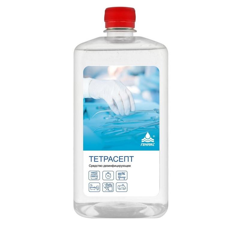 Дезинфицирующее средство (антисептик) Ника Тетрасепт 1 л<br><br><b>Назначение:</b> средство «Тетрасепт» представляет собой готовый к применению кожный антисептик в виде прозрачной бесцветной жидкости с характерным спиртовым запахом.<br><br><b>Режимы дезинфекции:</b> дезинфекция ИМН, не совмещённая с ПСО, дезинфекция кожных покровов, дезинфекция поверхностей.<br><br><b>Область применения:</b> детские учреждения (детсады, школы и т. п.); коммунальные объекты (бани, бассейны, гостиницы, общественные туалеты и т. п.); курортные, спортивные и культурно-оздоровительные комплексы; химико-фармацевтической.<br><br><b>Способ применения:</b> нанести на руки, растереть до высыхания жидкости.<br><br><b>Состав:</b> изопропиловый спирт — 15%, дидецилдиметиламмоний хлорид — 0,25%, полигексаметиленбигуанидин гидрохлорид (ПГМБгх) — 0,1%, а также функциональные добавки.<br><br><b>Условия хранения:</b> хранить при температуре от 30°С до 30°С.<br><br><b>Срок годности:</b> 60 месяцев. ТУ 20.20.14-137-12910434-2019..
