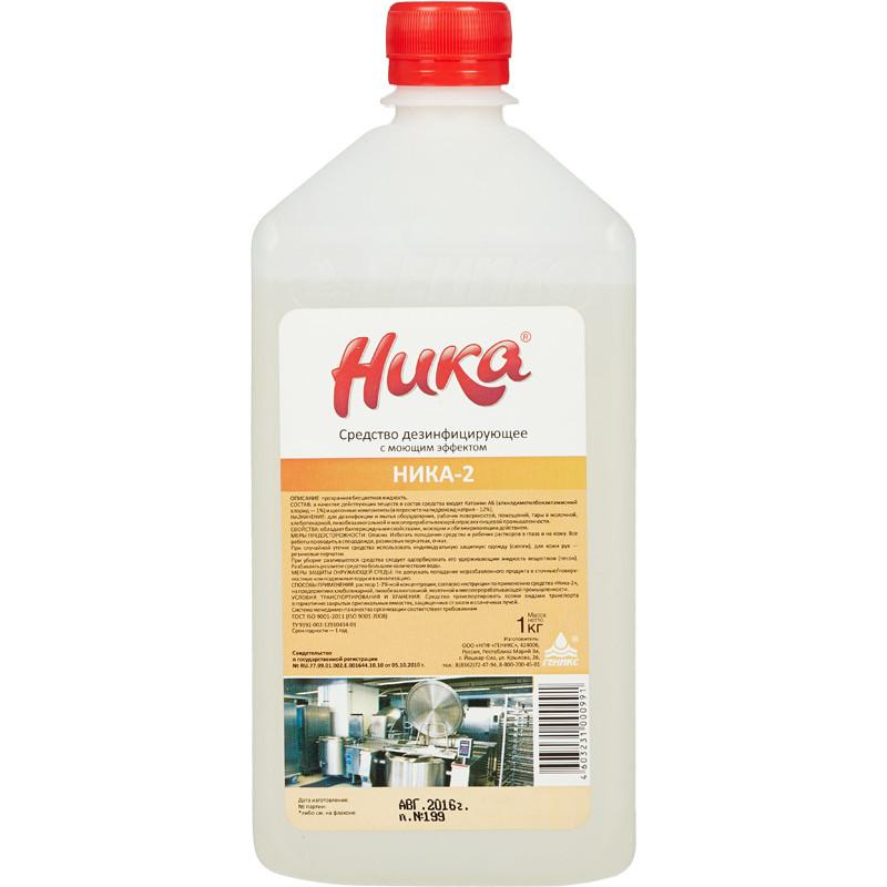 Дезинфицирующее средство с моющим эффектом Ника-2 1 кг (концентрат)<br><br><b>Назначение:</b><br>Средство предназначено для дезинфекции и мытья оборудования, рабочих поверхностей, помещений, тары. Антимикробная активность — бактерии, особо опасные инфекции, грибки.<br>Особенности:<br>— обезжиривающие и дезодорирующие свойства;<br>— способность разрушать находящиеся на поверхности биопленки микробного или белкового происхождения;<br>— растворы средства не вызывают коррозии, не портят обрабатываемые поверхности;<br>— средство не требует ротации;<br>— дезинфекция товарного яйца.<br>Область применения:<br>— предприятия молочной промышленности<br>— предприятия мясной промышленности<br>— предприятия по производству напитков<br>— предприятия хлебопекарной промышленности.<br><br><b>Способ применения:</b> рекомендуемая концентрация 1–2%.<br><br><b>Меры предосторожности:</b> при попадании в глаза, на кожу немедленно промыть большим количеством воды.<br>Хранить в недоступном для детей месте.<br><br><b>Состав:</b> катамин АБ ≤1%, щёлочь ≤12%.<br><br><b>Срок годности:</b> 24 месяца, срок годности рабочих растворов 21 день.