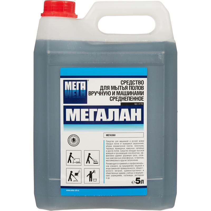 Щелочное среднепенное средство для машинной и ручной мойки водостойких полов Мега Мегалан 5л<br><br><b>Назначение.</b> Концентрированное щелочное средство от въевшихся загрязнений. Применяется для мытья твердых полов керамической плитки, линолеума, терраццо, мраморных, каменных, наливных и других полов. Средство обладает высокой моющей способностью и проникающей способностью, эффективно удаляет дорожную грязь, антигололедные реагенты, следы от резины, сложные комплексные атмосферные, почвенные, масложировые и другие загрязнения. Подходит для любых типов поломоечных машин.<br><b>Способ применения.</b> Применяется для машинной и ручной уборки поверхностей.<br>Очистка слабо- и среднезагрязненных поверхностей (ручная и механизированная):<br>Используйте рабочий раствор средства 0,5–2 концентрации (5–20 мл средства на 1 л воды). Нанеcти раствор ручным или механизированным способом на загрязненную поверхность, протереть и при необходимости промыть водой.<br>Очистка сильнозагрязненных поверхностей (ручная и механизированная):<br>Используйте рабочий раствор средства 2–10 концентрации (20–110 мл средства на 1 л воды). Нанеcти раствор ручным или механизированным способом на загрязненную поверхность, выдержать 2–5 минут, протереть щеткой и промыть водой. При необходимости обработать поверхность повторно.<br><b>Состав.</b> >30 очищенная вода, 5–15 фосфаты, <5 смесь НПАВ, <5 щелочные добавки, <5 соль ЭДТА, <5 растворитель, <5 краситель<br><b>Срок годности: </b>2 года с момента производства (при соблюдении условий хранения рекомендованных производителем)
