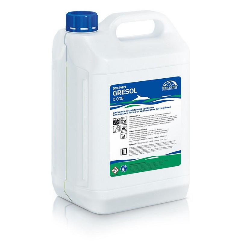 Щелочное низкопенное средство для генеральной очистки полов в зонах технического назначения Dolphin Gresol (D 008) 5л<br><br><b>Назначение.</b> Сильнощелочное низкопенное концентрированное средство для периодической и генеральной очистки полов с загрязнениями технического характера. Средство обладает высокоэффективным направленным действием, удаляет нефтепродукты, технические масла, смазочные материалы, сажу, следы от резины. Рекомендуется для применения на промышленных объектах для очистки застарелых, въевшихся загрязнений.<br><b>Способ применения.</b> Применяется для машинной уборки. Используется в виде водного раствора в концентрации 0,5–3 раствор (5–30 мл / 1 л воды) в зависимости от способа применения и степени загрязнения. При концентрации более 1 раствора (10 мл / 1 л воды) требует смывания.<br>Для генеральной уборки применять методом замачивания на 10–15 мин. в концентрации 30 мл / 1 л воды = 3 раствор, с последующей обработкой роторной машиной или ручными щетками. После очистки требуется повторная промывка водой.<br><b>Состав.</b> анионные ПАВ 5–15, триполифосфат натрия 0–5, неионогенные ПАВ 0–5, соли НТА 0–5<br><b>Срок годности: </b>2 года <!--noindex-->с момента производства (при соблюдении условий хранения рекомендованных производителем)<!--/noindex-->