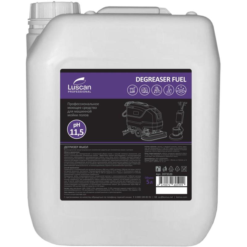 <b>Средство для машинной и ручной мойки поверхностей от нефтемаслянных загрязнений Luscan Professional Deqreaser Fuel 5 л (концентрат).</b> <br> Высокощелочное концентрированное низкопенное средство для поломоечных машин и роторов.<br> <b>Область применения.</b> <br> Предназначено для периодической и генеральной уборки полов с сильной степенью загрязнения, для мытья с использованием поломоечных машин. Эффективно удаляет масложировые и эксплуатационные загрязнения, нефтепродукты, консервационные смазки, пыль, сажу, копоть. Обладает высокой моющей и проникающей способностью, эффективно работает в воде любой жесткости и температуры. Может использоваться для уборки складских и производственных помещений, территорий автозаправок, для очистки технологического оборудования, деталей, узлов и механизмов, мойки транспортных средств на объектах сферы обслуживания и коммунального хозяйства. Объектах машиностроения, нефтедобывающей и нефтеперерабатывающей промышленности, на железнодорожном, водном и автомобильном транспорте.<br> <b>Способ применения.</b> <br> Применяется в поломоечной или роторной машине, АВД или в МОП-системах. Рабочие растворы наносят методами орошения, протирания. Температурный режим мойки от 20 °С до 60 °С. Используется в виде водного раствора в концентрации от 0,5% до 10% (5–100 мл средства на 1 л воды) в зависимости от способа применения и степени загрязнения поверхности.<br> Генеральная мойка сильнозагрязненных поверхностей (ручная и механизированная): Рабочий раствор 2%—10% концентрации (20–100 мл средства на 1 л воды). Нанести механизированным способом на загрязненную поверхность, при необходимости собрать грязный раствор, промыть чистой водой и протереть насухо. В местах наибольшей концентрации загрязнения следует оставить раствор для воздействия на 2–15 минут, использовать механическое воздействие поломоечной либо роторной машины. Руководствоваться соответствующими инструкциями по эксплуатации поломоечных машин. <br> Для применения через АВД использовать 10% раствор (1000 мл средства на 10л воды).<br> <b>Состав:</b> вода умягченная ≥30%, НПАВ 5-15%, гидроксид калия 5-15%, этоксилат жирного спирта C9-С11 <5%, комплексообразователи <5%, растворитель <5%, метоксипропанол <5%, ингибитор коррозии <5%, отдушка <5%.<br> <b>Условия хранения:</b> хранить в заводской упаковке, плотно закрытым, при температуре от +5 °С до +30 °С, вдали от источников тепла, избегая попадания прямых солнечных лучей, отдельно от пищевых продуктов, в местах недоступных для детей и животных.<br> <b>Меры предосторожности:</b> избегать попадания средства в глаза и на кожу. При попадании на слизистые промыть большим количеством воды. При необходимости обратиться к врачу.<br> <b>Срок годности:</b> 24 месяца при соблюдении условий хранения и транспортировки.