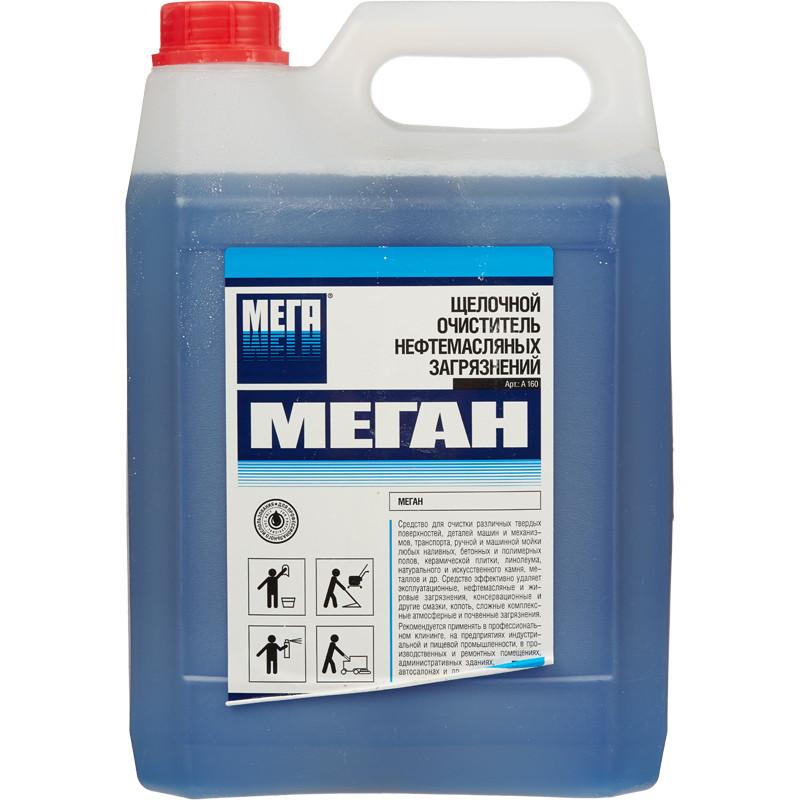Щелочное среднепенное средство для машинной и ручной мойки полов и поверхностей от нефтемасленных загрязнений МЕГА Меган 5л <br><br><b>Назначение.</b> Концентрированное щелочное средство от въевшихся загрязнений. Применяется для мытья твердых полов керамической плитки, линолеума, терраццо, мраморных, каменных, наливных и других полов. Средство обладает высокой моющей способностью и проникающей способностью, эффективно удаляет дорожную грязь, антигололедные реагенты, следы от резины, сложные комплексные атмосферные, почвенные, масложировые и другие загрязнения. Подходит для любых типов поломоечных машин.<br><b>Способ применения.</b> Применяется для машинной и ручной уборки поверхностей.<br>Очистка слабо- и среднезагрязненных поверхностей (ручная и механизированная):<br>Используйте рабочий раствор средства 0,5–2 концентрации (5–20 мл средства на 1 л воды). Нанеcти раствор ручным или механизированным способом на загрязненную поверхность, протереть и при необходимости промыть водой.<br>Очистка сильнозагрязненных поверхностей (ручная и механизированная):<br>Используйте рабочий раствор средства 2–10 концентрации (20–110 мл средства на 1 л воды). Нанеcти раствор ручным или механизированным способом на загрязненную поверхность, выдержать 2–5 минут, протереть щеткой и промыть водой. При необходимости обработать поверхность повторно.<br><b>Состав.</b> >30 очищенная вода, 5–15 фосфаты, <5 КПАВ, <5 НПАВ, <5 растворитель, <5 щелочные добавки, <5 краситель<br><b>Срок годности: </b>2 года с момента производства (при соблюдении условий хранения рекомендованных производителем)