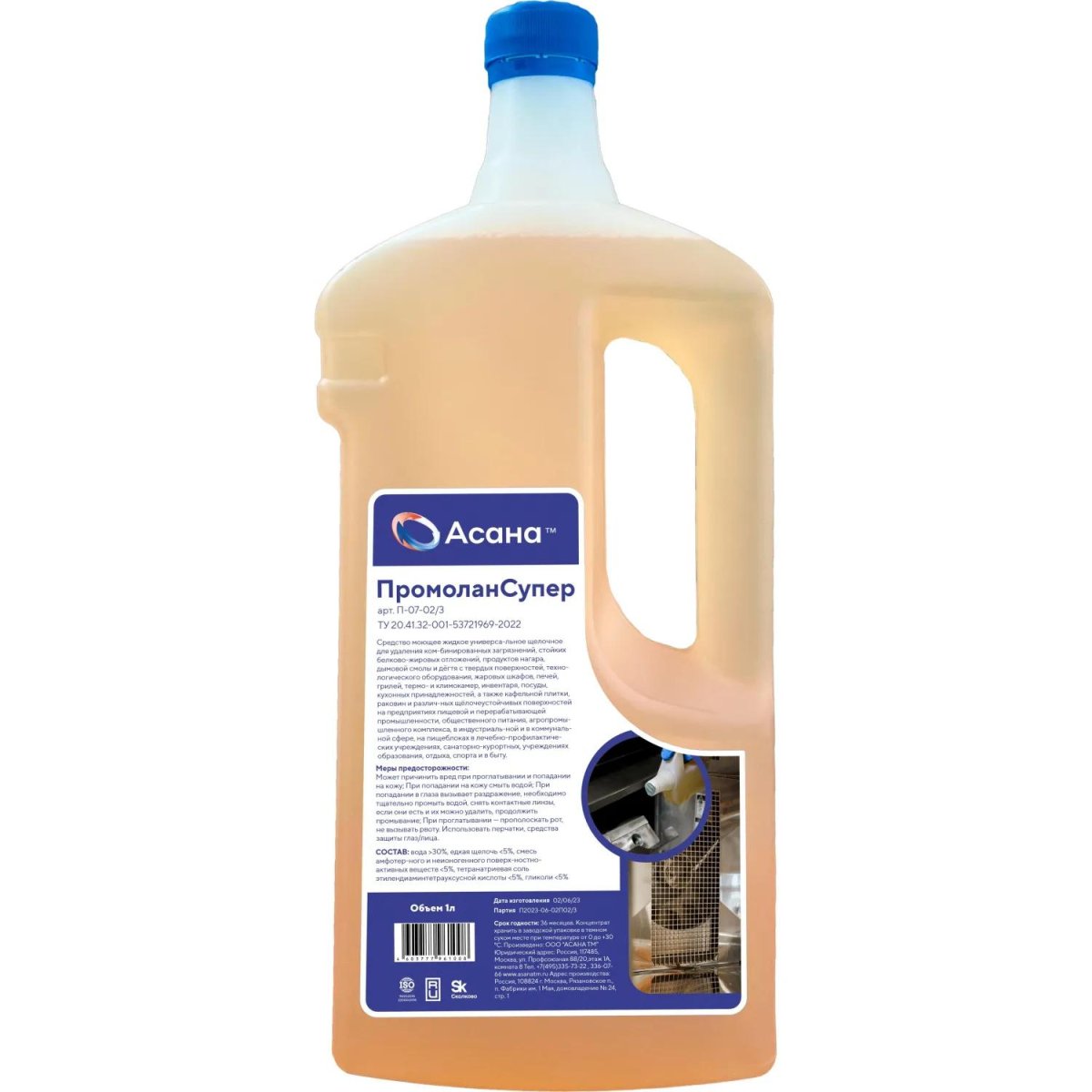<br><br><b>Назначение:</b> данная фасовка с фольгированным горлышком предназначена для мойки конвекционных печей Debag. Моющее средство Асана Промолан Супер для удаления комбинированных загрязнений, стойких белково-жировых отложений, продуктов нагара, дымовой смолы и дёгтя с твёрдых поверхностей, жаровых шкафов, печей (DEBAG,MIWE,LAINOX), грилей, термо- и климокамер, инвентаря, посуды, кухонных принадлежностей, а также кафельной плитки, раковин и различных щёлочеустойчивых поверхностей на предприятиях пищевой и перерабатывающей промышленности, общественного питания, агропромышленного комплекса, в индустриальной и в коммунальной сфере, на пищеблоках в лечебно-профилактических учреждениях, санаторно-курортных, учреждениях образования, отдыха, спорта и в быту.<br><b>Состав:</b> вода >30%, едкая щёлочь <5%, смесь амфотерного и неионогенного поверхностно-активных веществ <5%, тетранатриевая соль, этилендиаинтетрауксусной кислоты <5%, гликоли <5%.<br><b>Способ применения:</b> средство применяется в готовом виде для автоматической мойки оборудования, согласно штатной программе, для ручной мойки оборудования при температуре 20-80 С.<br><b>Меры предосторожности:</b> при попадании на кожу смыть водой. При попадании в глаза вызывает раздражение, необходимо тщательно промыть водой, снять контактные линзы, если они есть и их можно удалить, продолжить промывание. При проглатывании — прополоскать рот, не вызывать рвоту. Использовать перчатки, средства защиты глаз/лица.<br><b>Условия хранения:</b> концентрат хранить в заводской упаковке в тёмном прохладном месте при температуре от 0 до +30 °С.<br><b>Срок годности:</b> 36 месяцев, с даты изготовления (дату изготовления см. на упаковке).