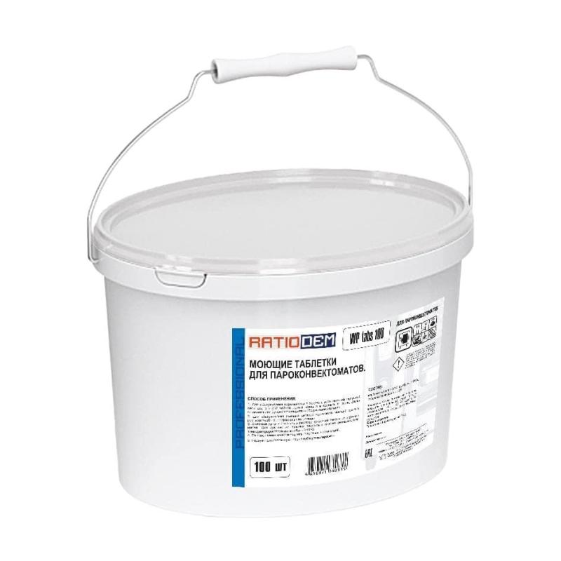 Таблетки для пароконвектомата моющие Ratiodem WP tabs 100 (100 таблеток в упаковке)<br><br><b>Назначение:</b> предназначено для очистки поверхности камеры пароконвектомата. <br><br><b>Способ применения:</b> <br>1. Поместить таблетки внутрь рабочей камеры, в отведённое для них место.<br>2. Запустить режим автоматической мойки пароконвектомата, согласно инструкции производителя обслуживаемой модели. <br><br><b>Меры предосторожности:</b> вызывает ожоги кожи и повреждения глаз. При работе со средством пользоваться средствами защиты рук и глаз/лица. При попадании на кожу и в глаза тщательно промыть водой. При необходимости обратиться к врачу-специалисту. <br><br><b>Состав:</b> гидроксид натрия 15–30%; комплексообразователи 5–15%, неионогенные ПАВ <5%. <br><br><b>Условия хранения:</b> хранить в сухом помещении в плотно закрытой оригинальной упаковке при температуре от −5°C до 25°C, вдали от источников тепла, отдельно от пищевых продуктов.<br><br><b>Срок годности:</b> 3 года.